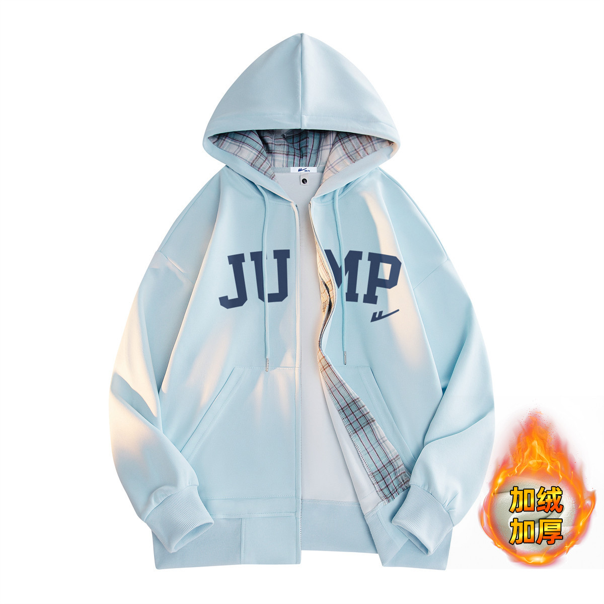 美式复古加绒加厚格纹连帽卫衣潮休闲拉链开衫情侣款外套 802387