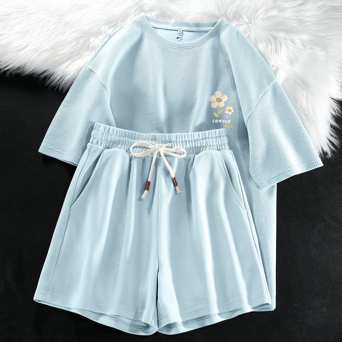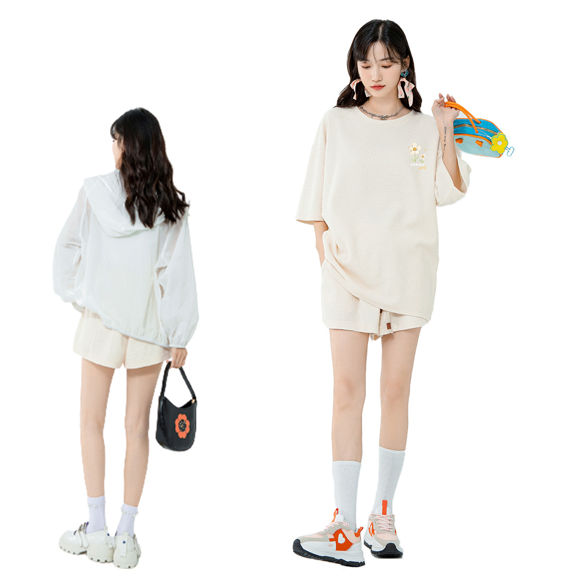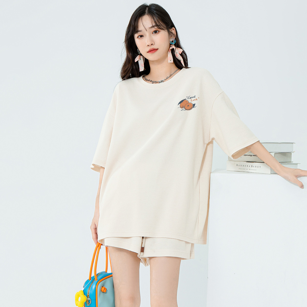 【女装】华夫格运动套装女夏季宽松重磅中长T+三分短裤 737875