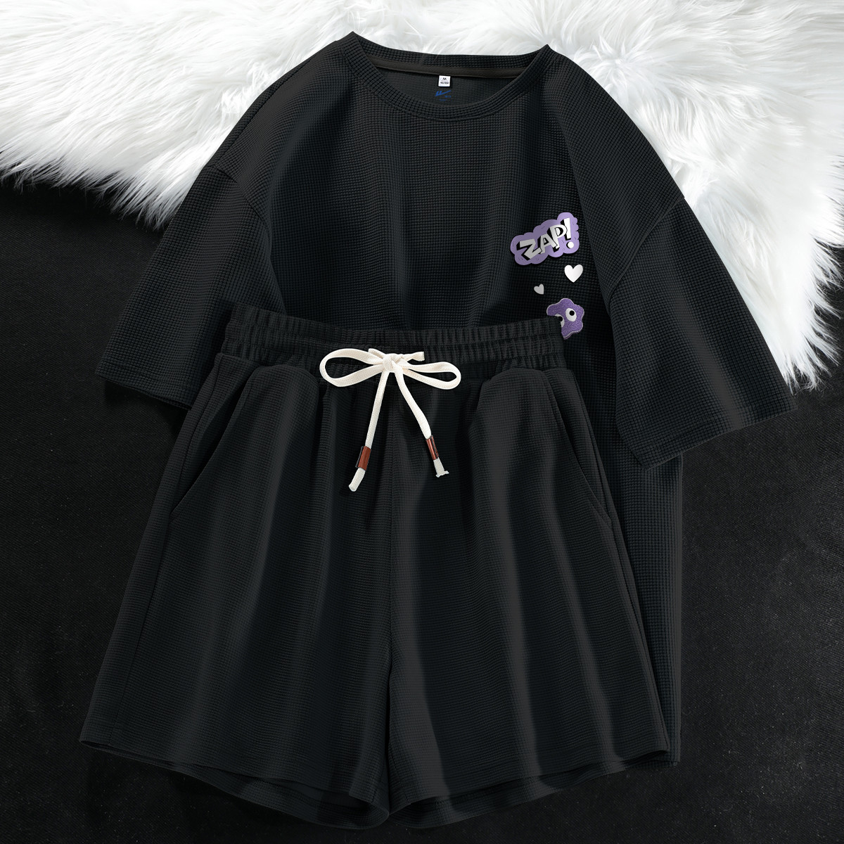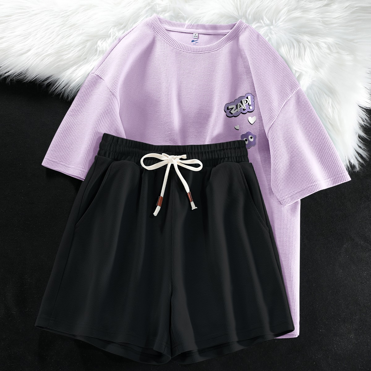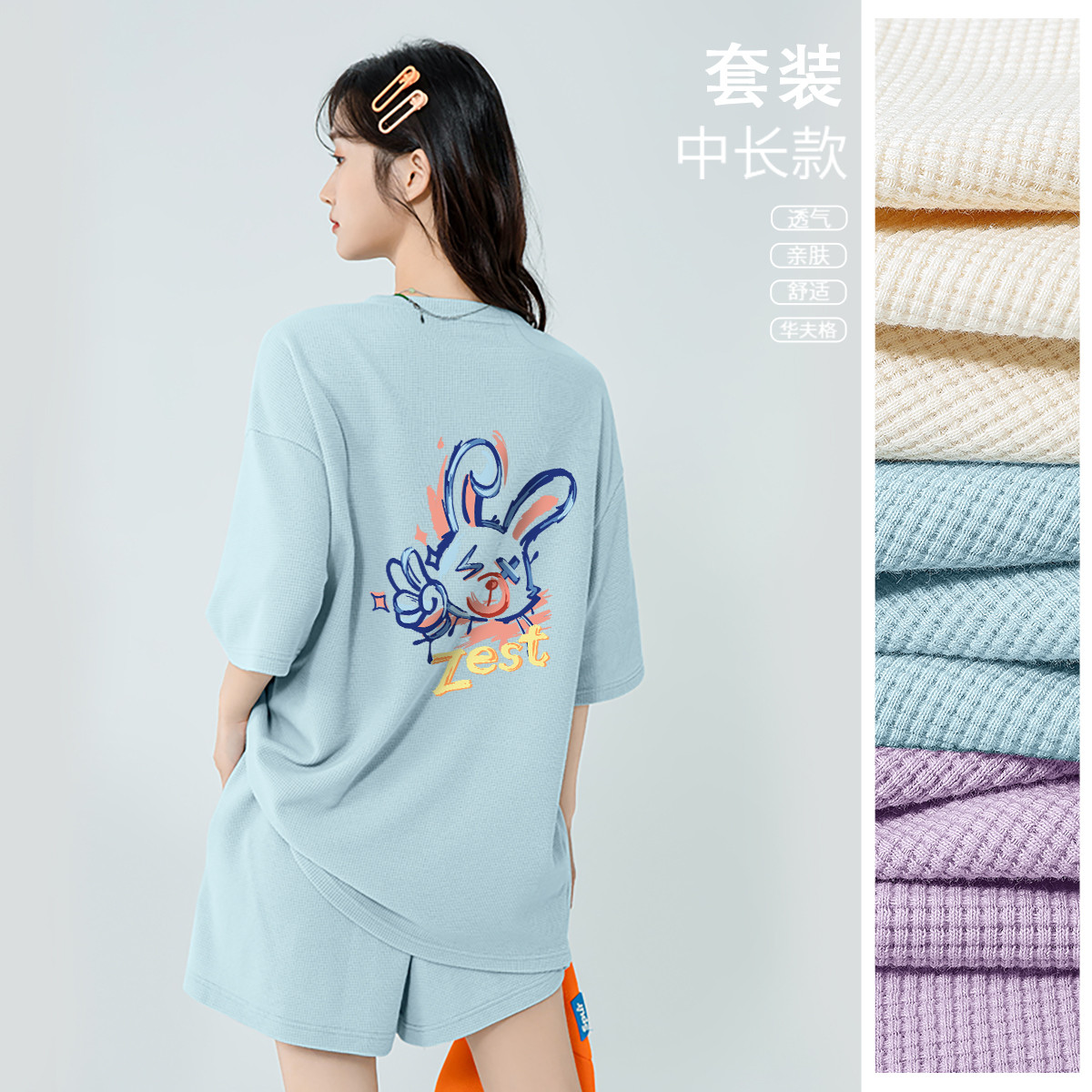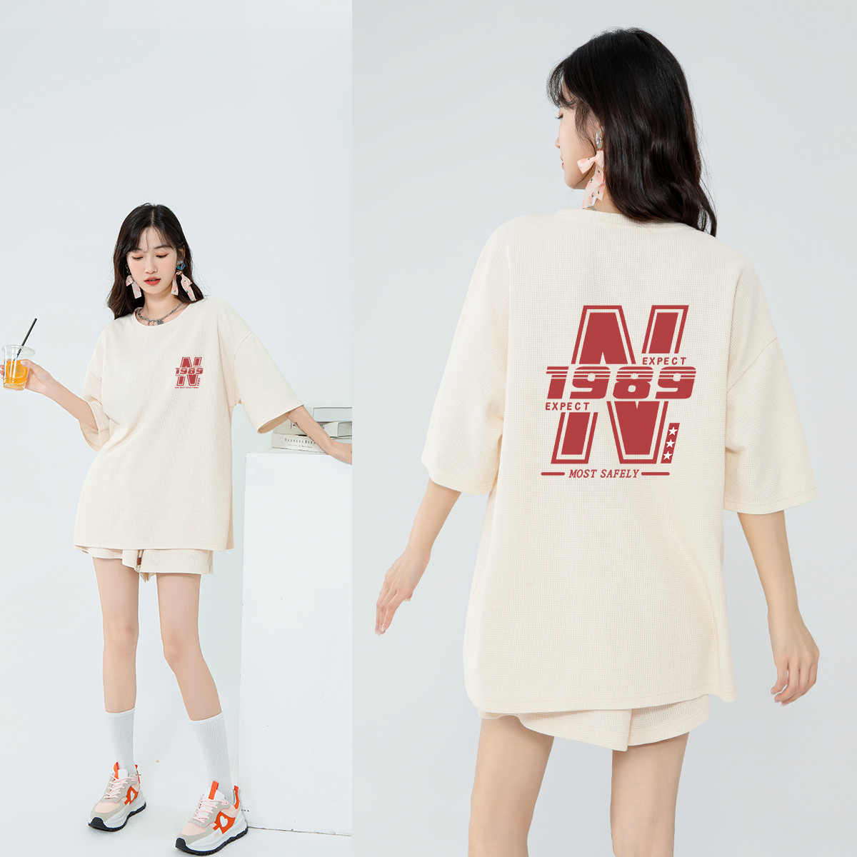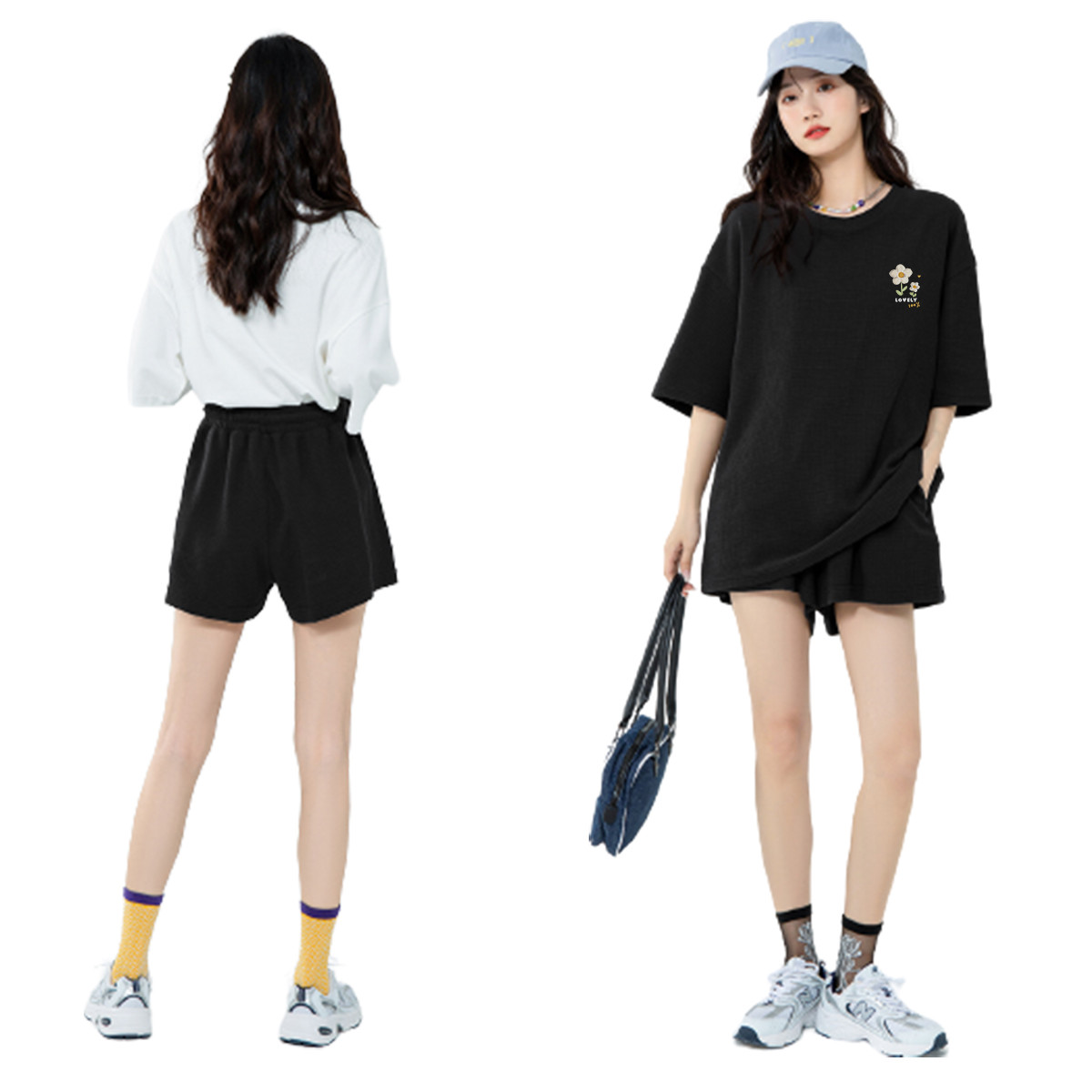 【女装】华夫格运动套装女夏季宽松重磅中长T+三分短裤 420307