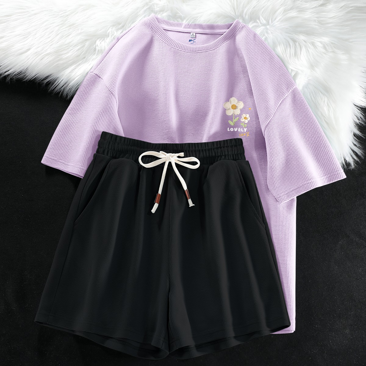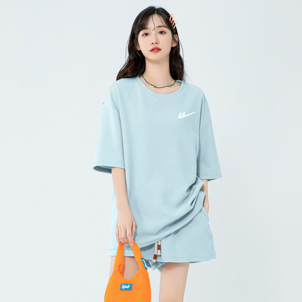 【女装】华夫格运动套装女夏季宽松重磅中长T+三分短裤 328595