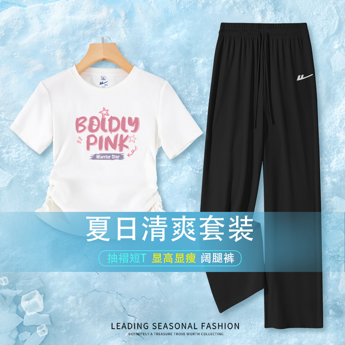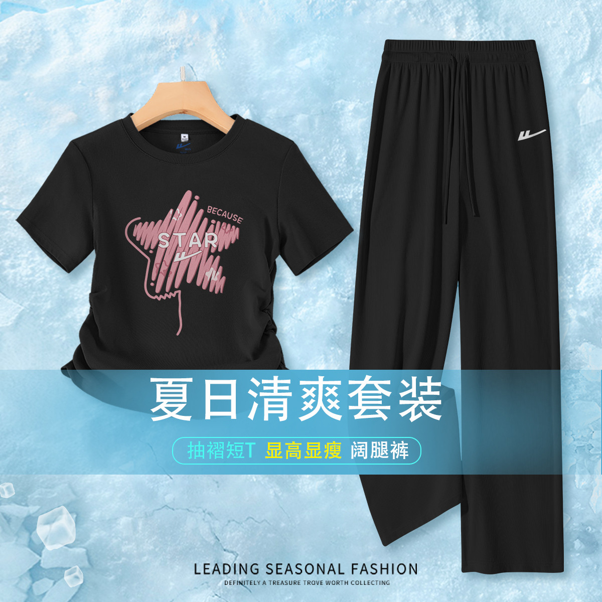 【女装】夏季运动套装女抽褶短款T恤+薄款休闲阔腿裤清爽套装 872531