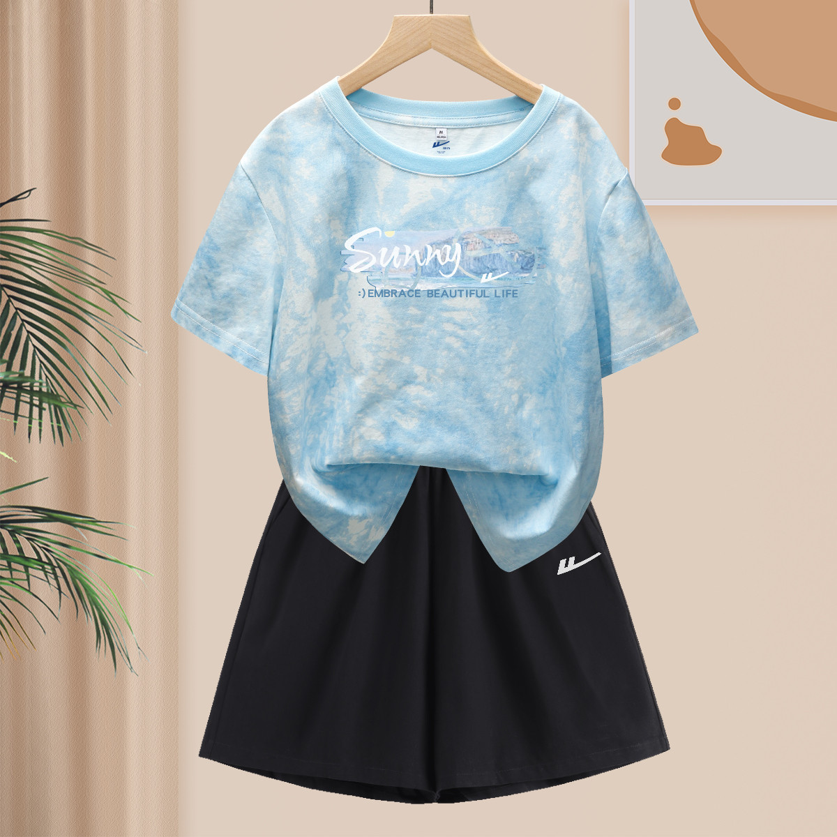 【女装】夏季运动套装女扎染短款T恤+斜纹棉三分裤纯棉两件套 930195