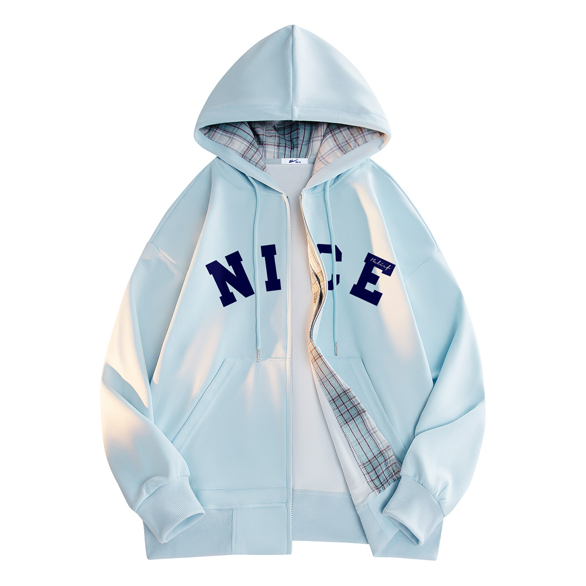 嘻哈美式潮牌字母格子拼接连帽开衫外套男女春秋宽松帽衫拉链外套 382163
