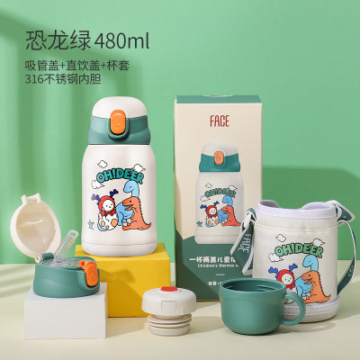 FACE 儿童一杯两盖吸管保温杯(含杯套)恐龙绿 480ml