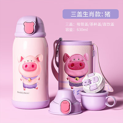 韩国 杯具熊(BEDDYBEAR)儿童带吸管保温水杯礼盒版 生肖猪 630ml