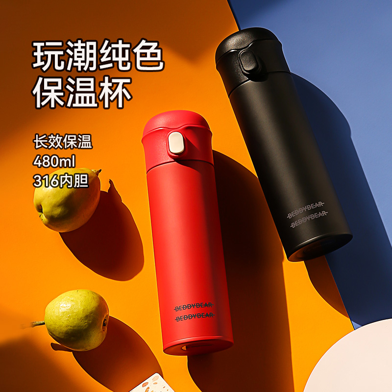【品牌秒杀】杯具熊成人纯色吸管杯316内胆单手弹盖车载便携时尚保冷保温畅饮杯 480ml