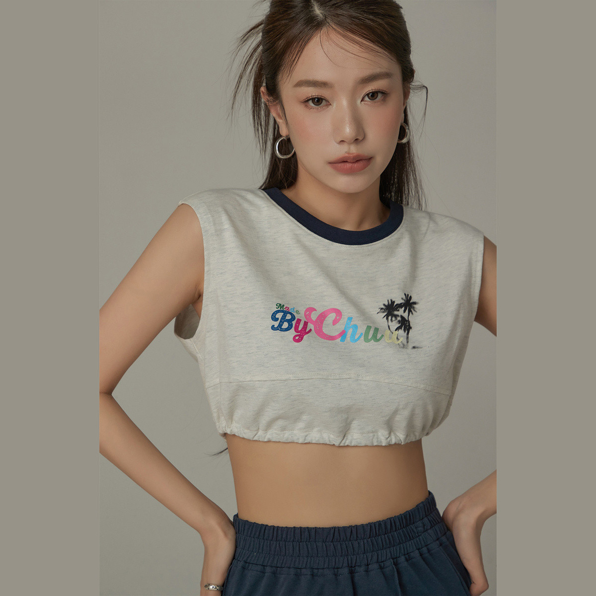 CHUU印花背心女春夏撞色松紧腰短款无袖上衣 335123