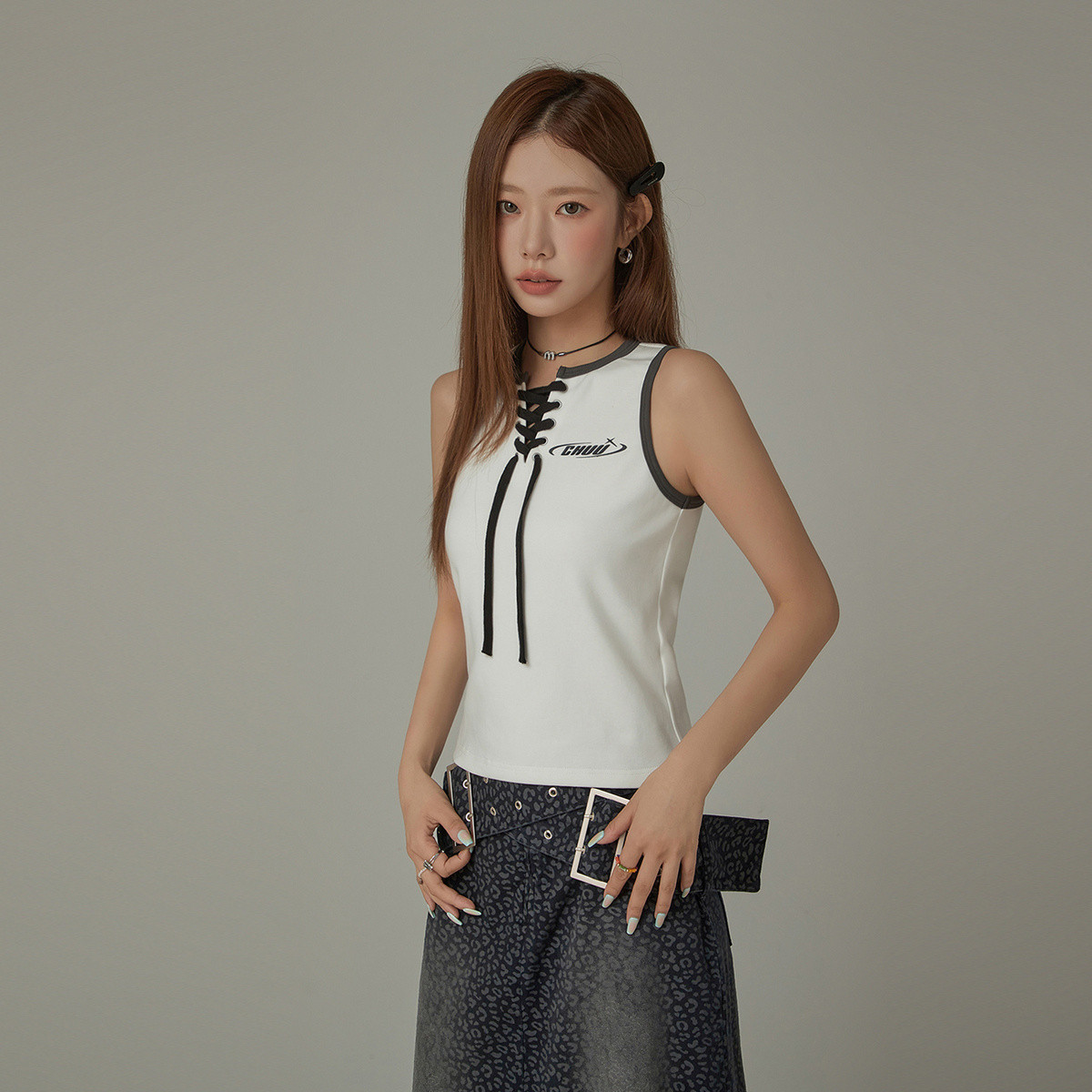 CHUU印花无袖背心女春夏镂空吊带撞色中长上衣 689363