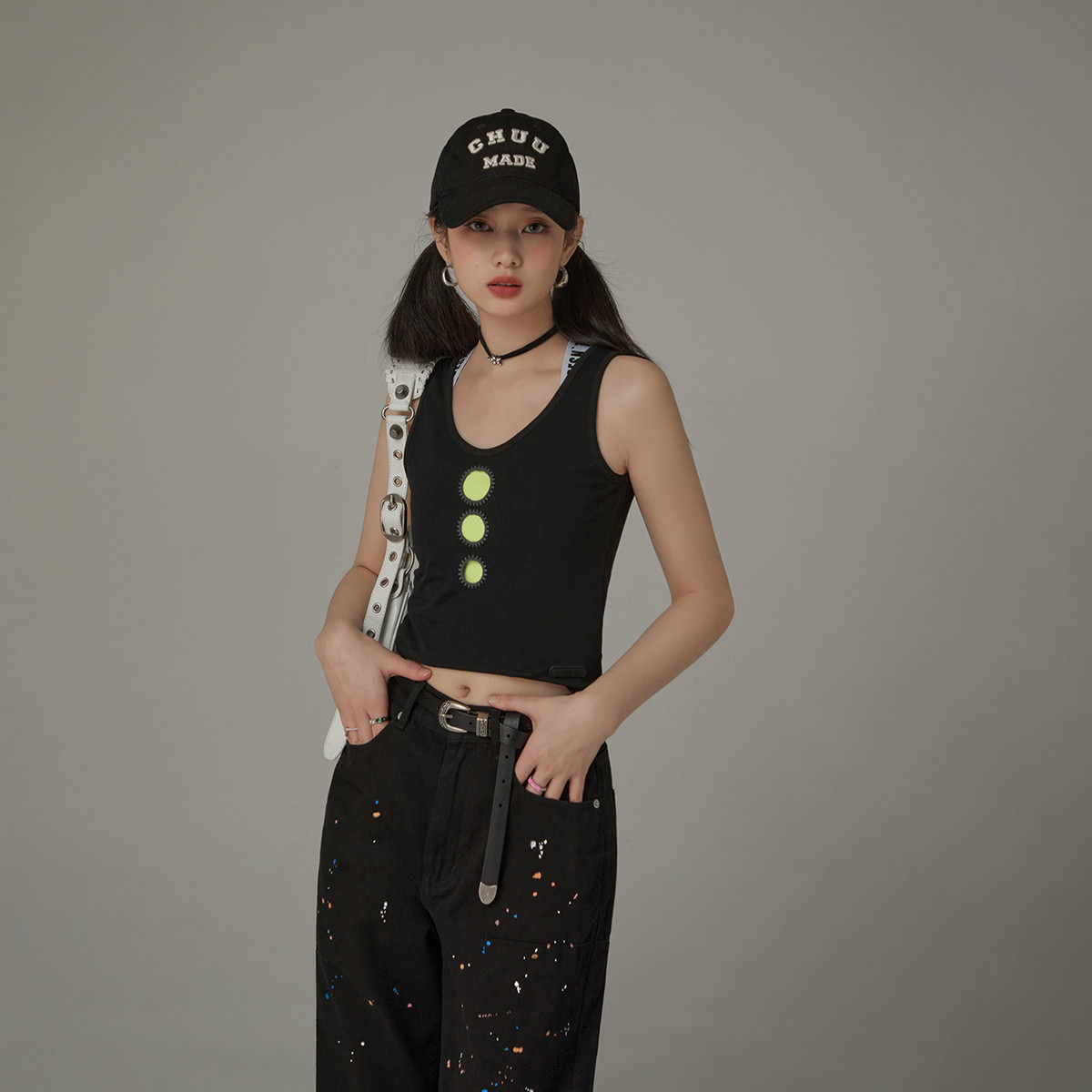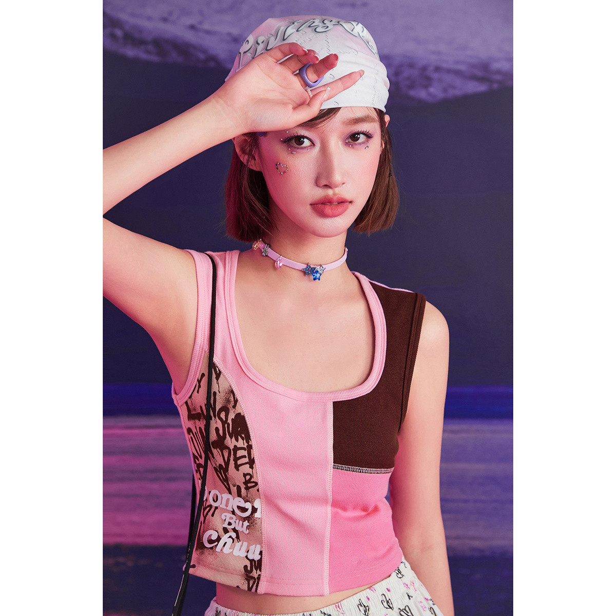 CHUU印花背心女春夏撞色松紧腰短款无袖上衣 326931