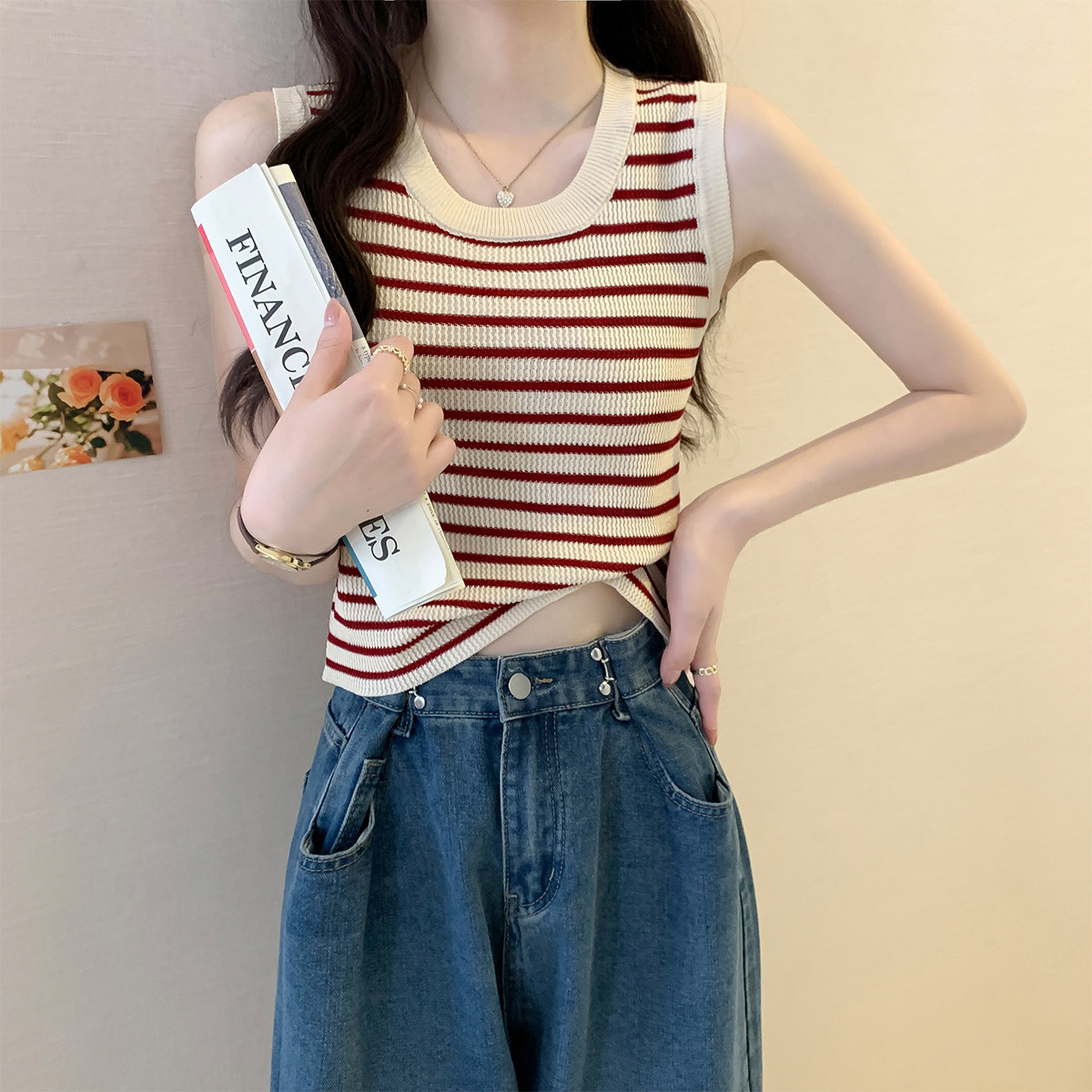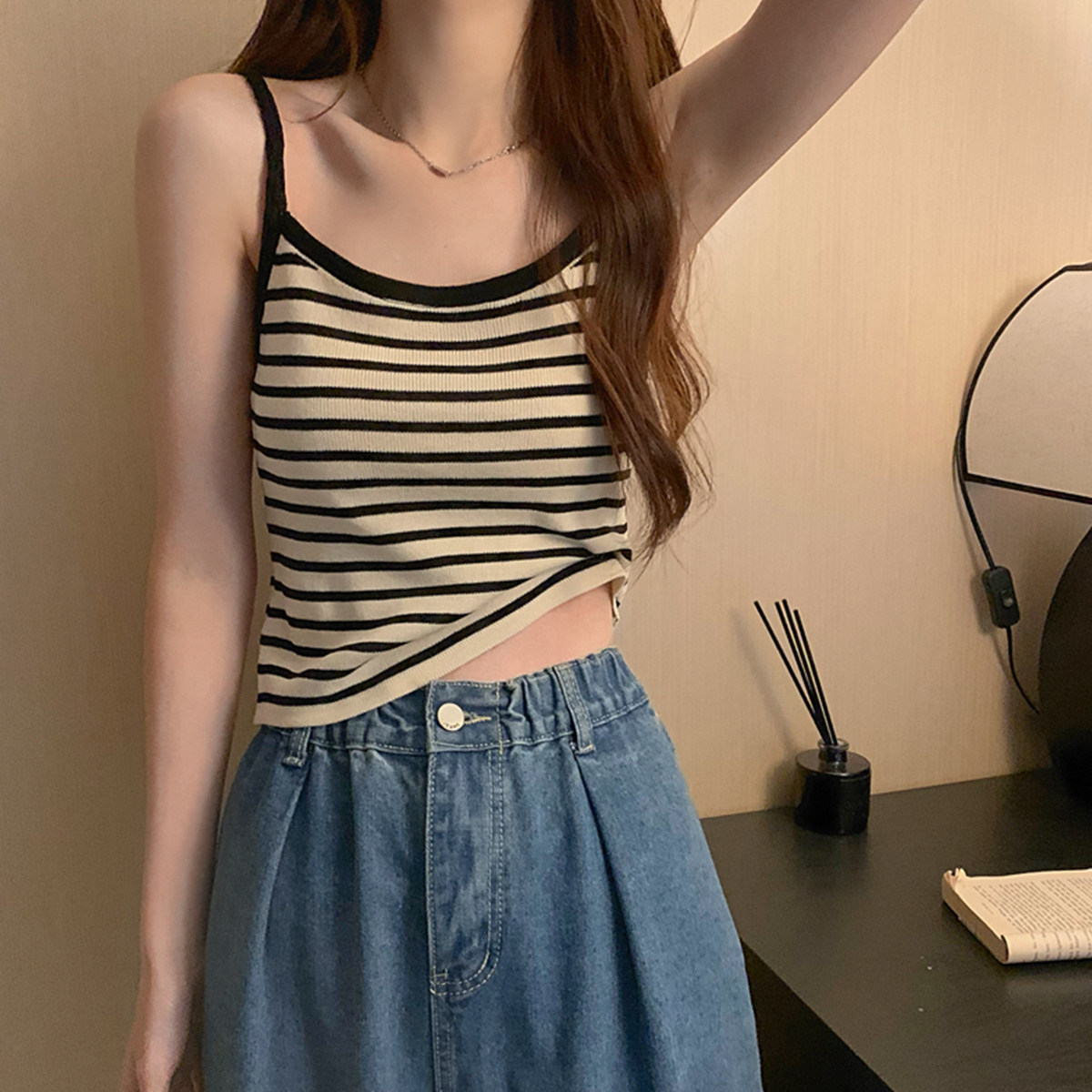 条纹背心女短款打底衫薄款针织上衣外穿吊带背心女 659779
