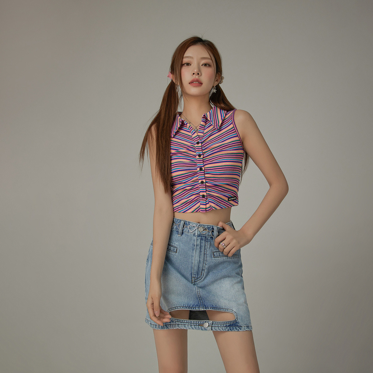 CHUU彩虹条背心女春夏设计感褶皱短款无袖上衣 028627