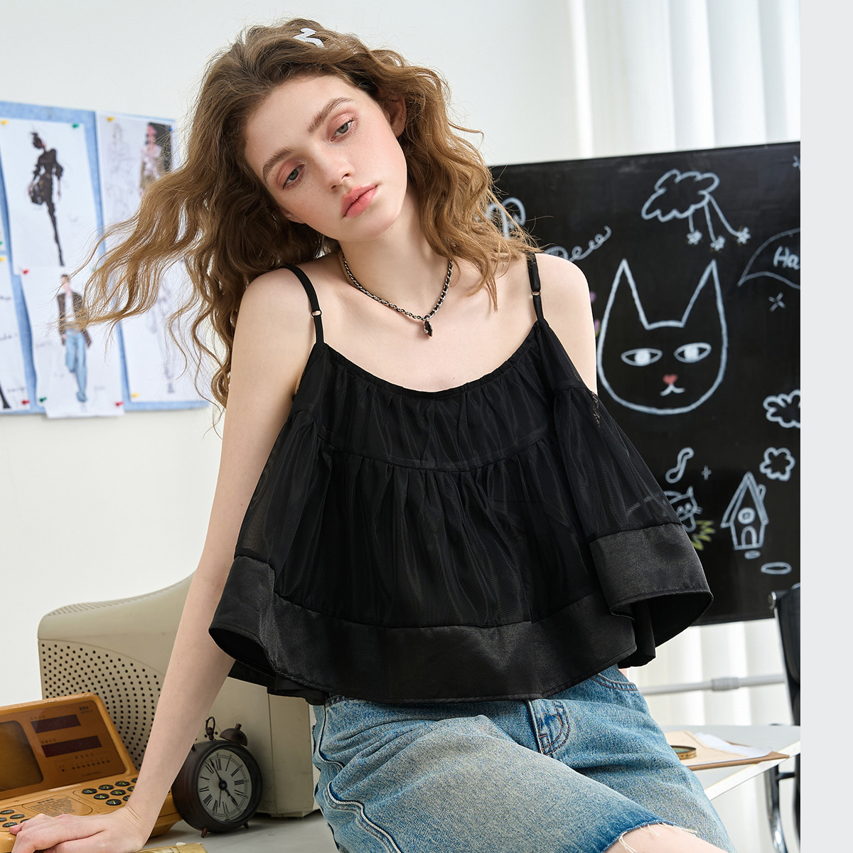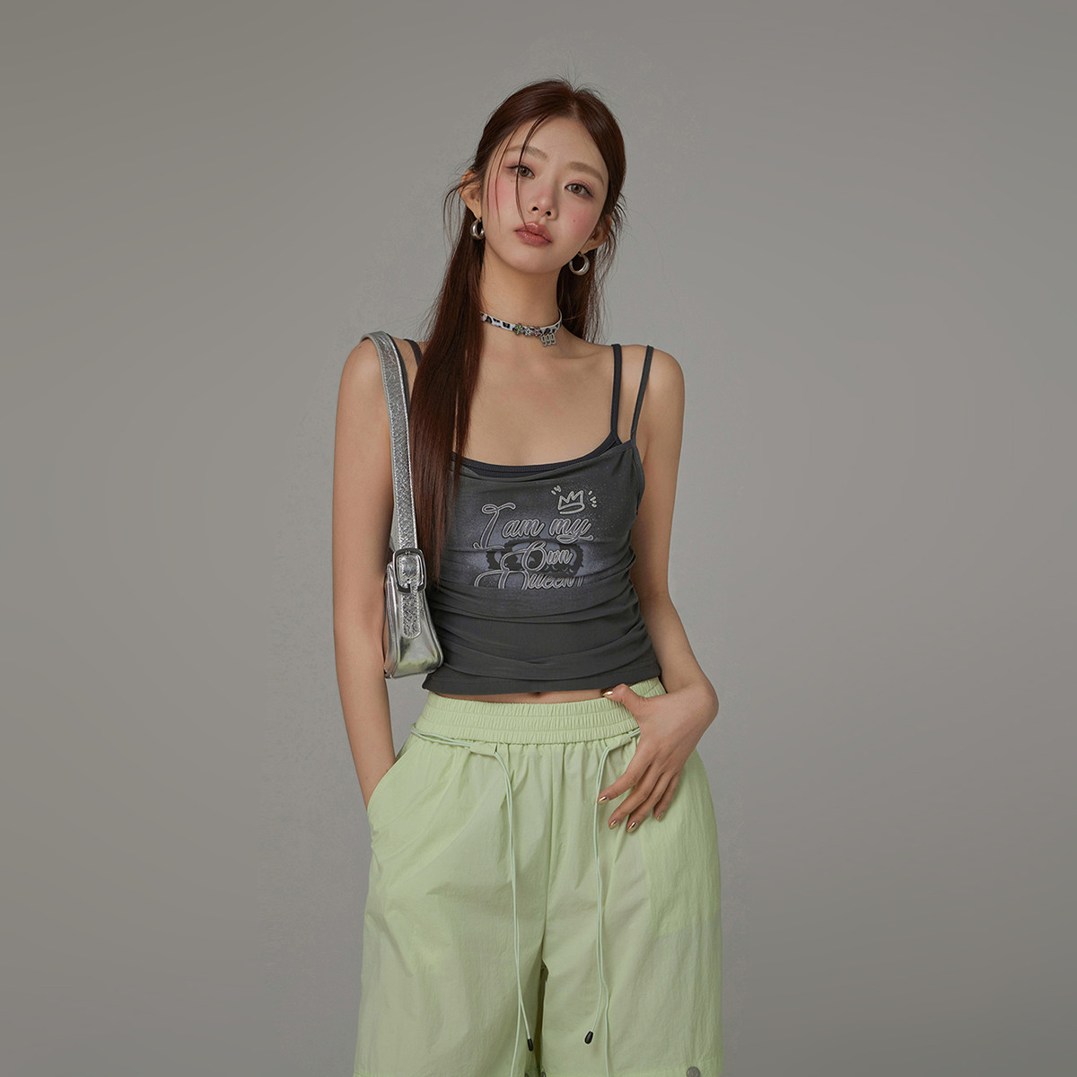 皇冠字母印花吊带背心女2025夏假两件拼接纱网短上衣 731091