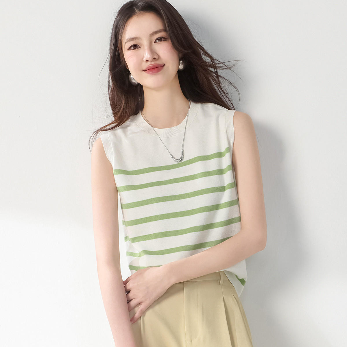 圆领经典条纹含桑蚕丝无袖薄款针织衫女背心马甲春夏T恤上衣 163155