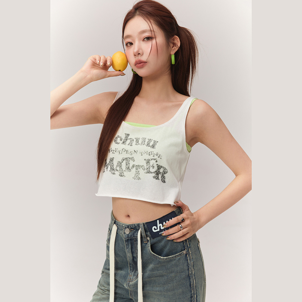 CHUU印花背心女春夏撞色松紧腰短款无袖上衣 326931