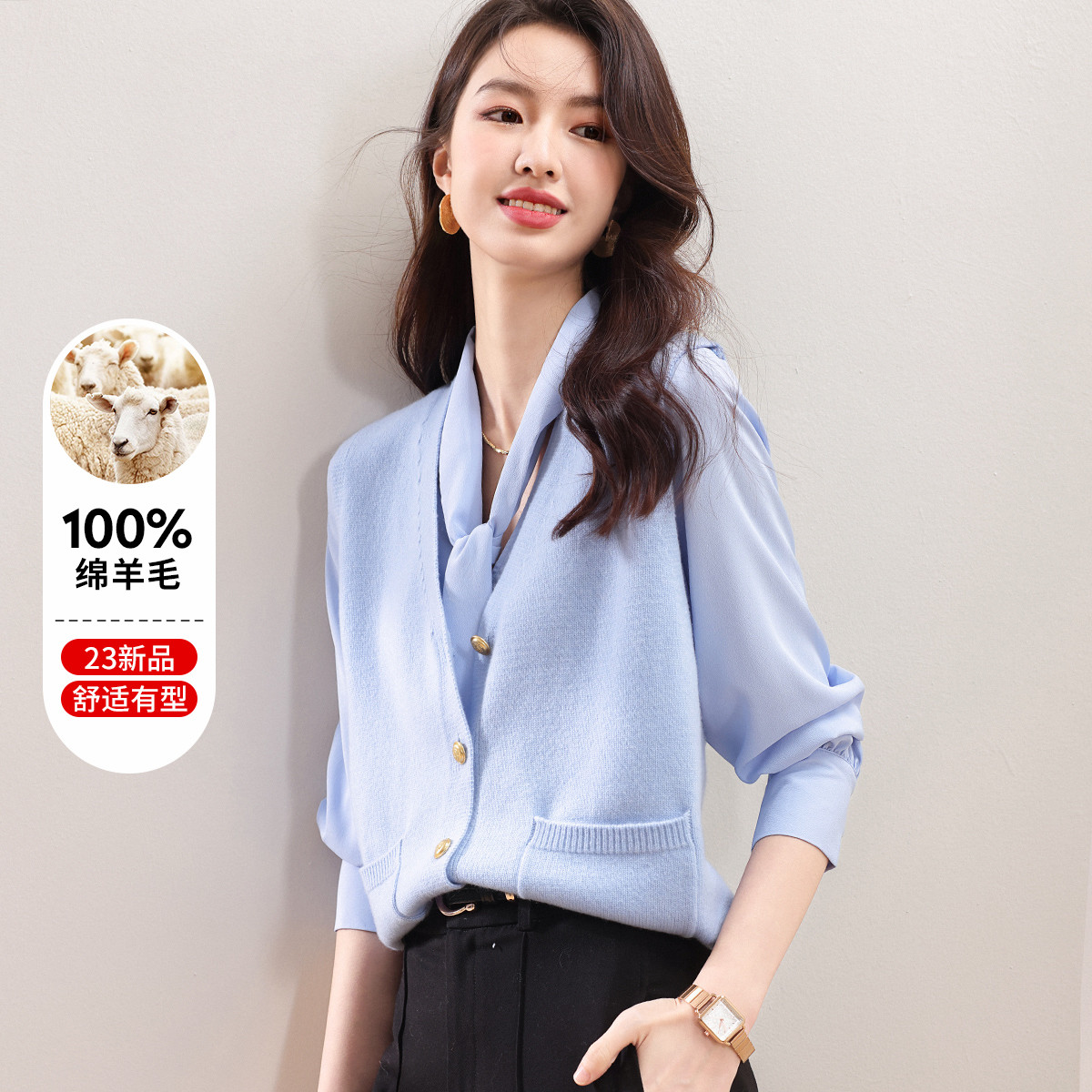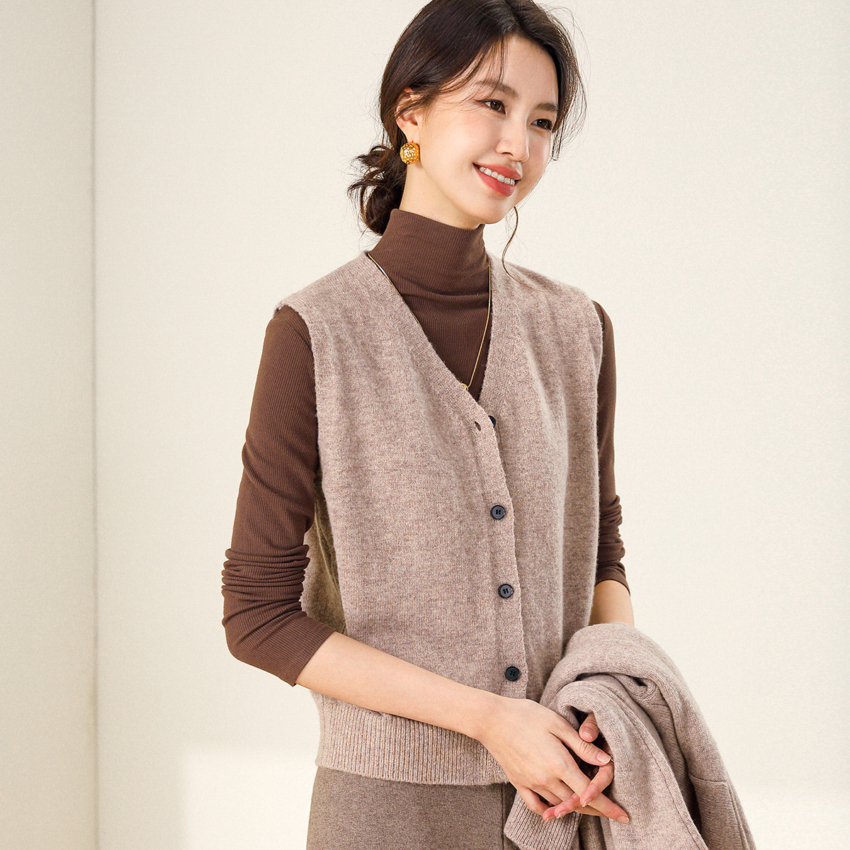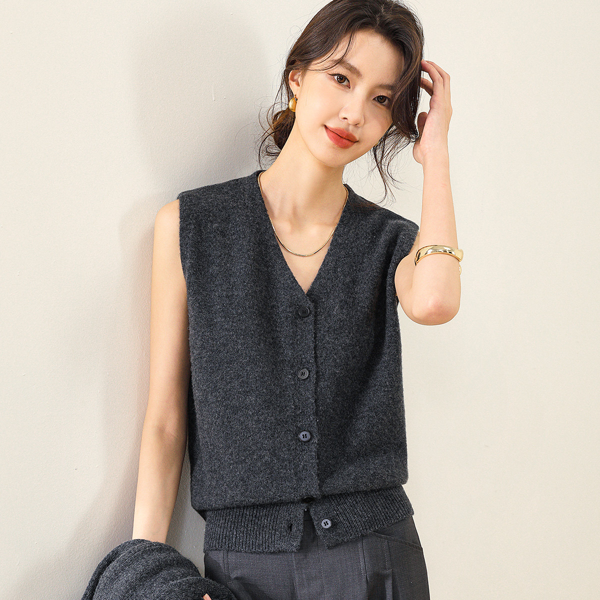 【100%绵羊毛】V领纯色休闲百搭纽扣羊毛开衫背心春装上衣 991955