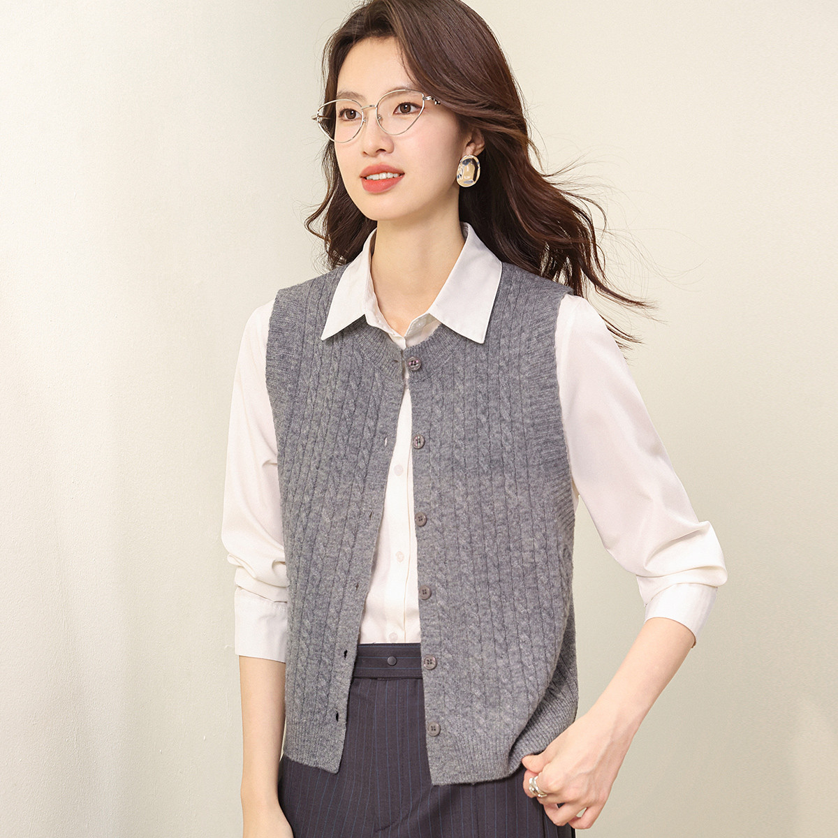 【100%绵羊毛】简约百搭纯色圆领绞花羊毛开衫背心马夹 514323