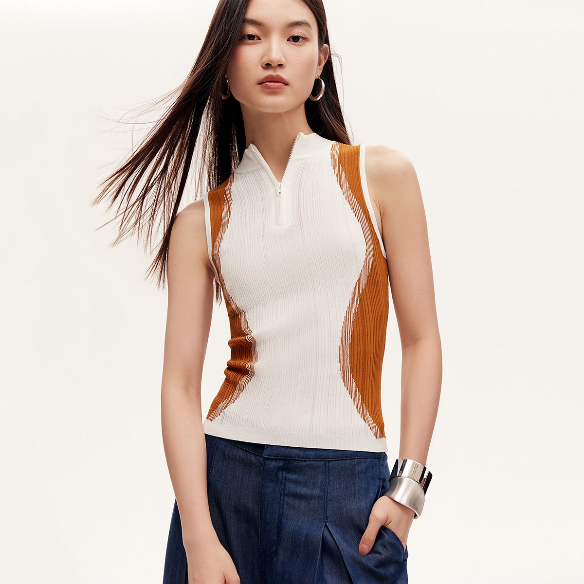 休闲运动条纹撞色含桑蚕丝针织打底背心马夹坎肩轻薄透气 773843