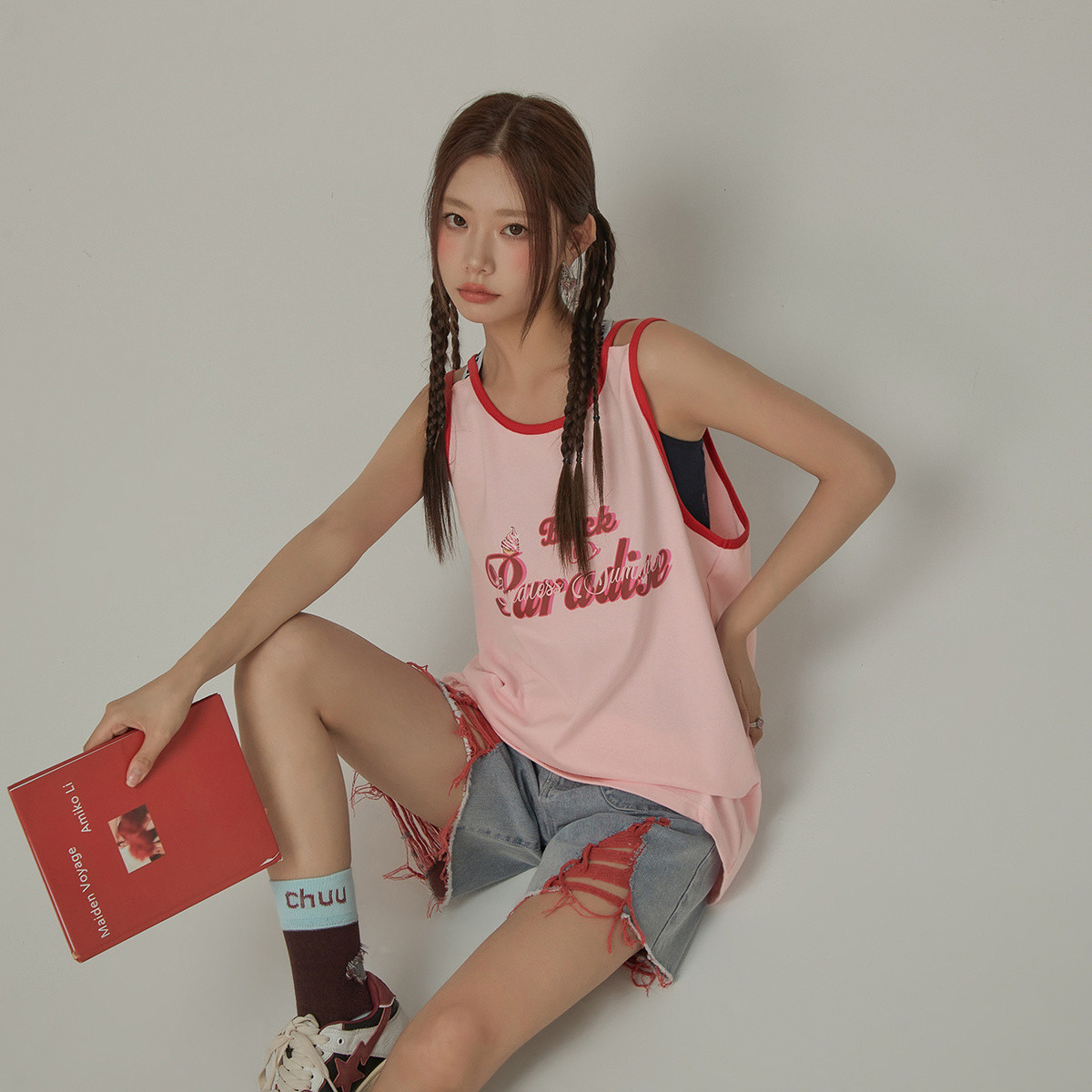 条纹磨破爱心贴布背心女2025夏甜美软萌撞色工字吊带 982803