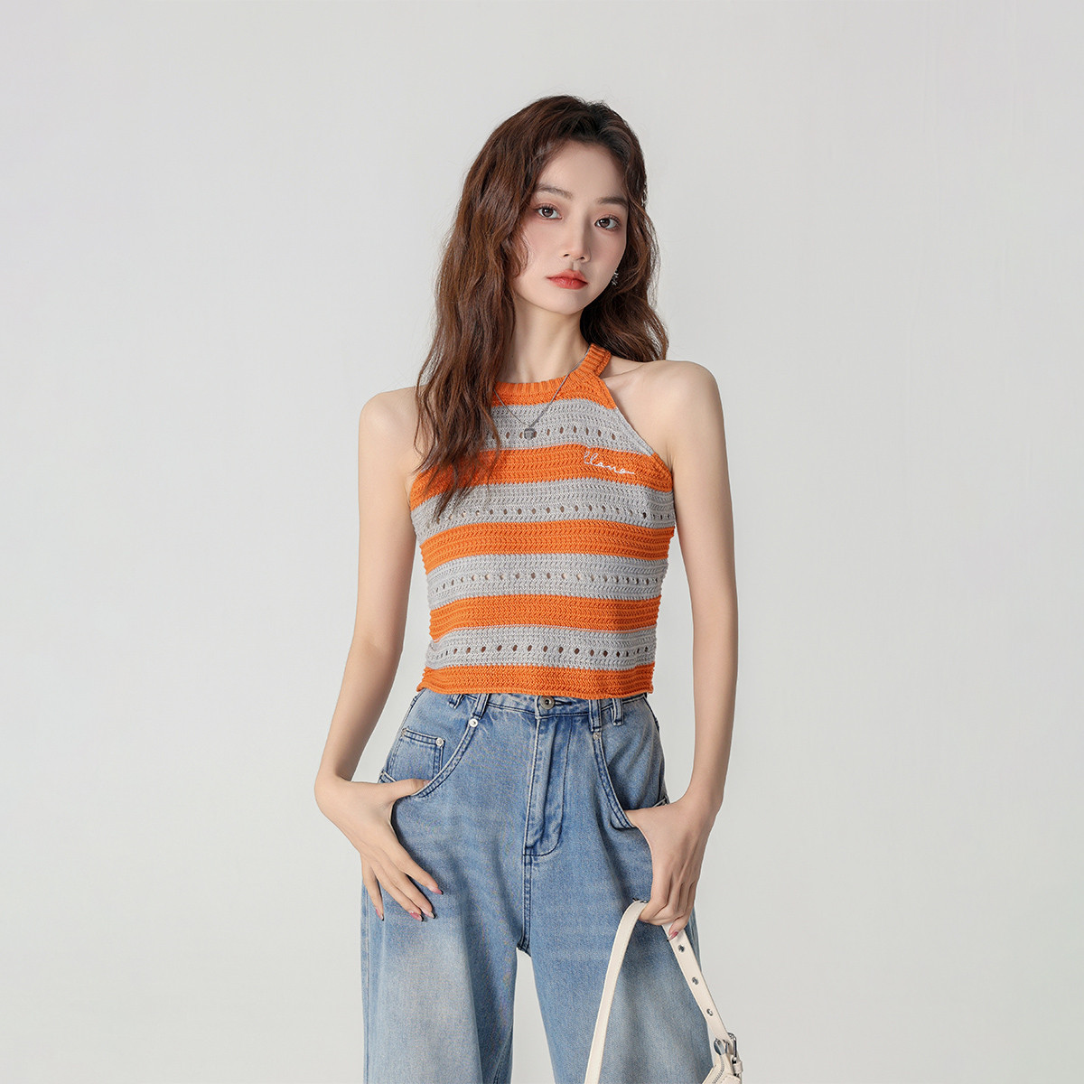 纯欲削肩条纹背心女设计感独特别致外穿挂脖式上衣 635971