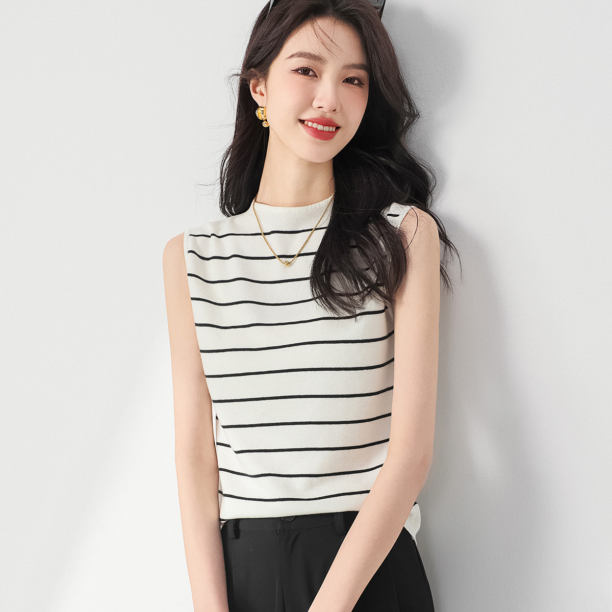 【含桑蚕丝】轻薄透气圆领经典条纹针织打底背心马夹坎肩 913171