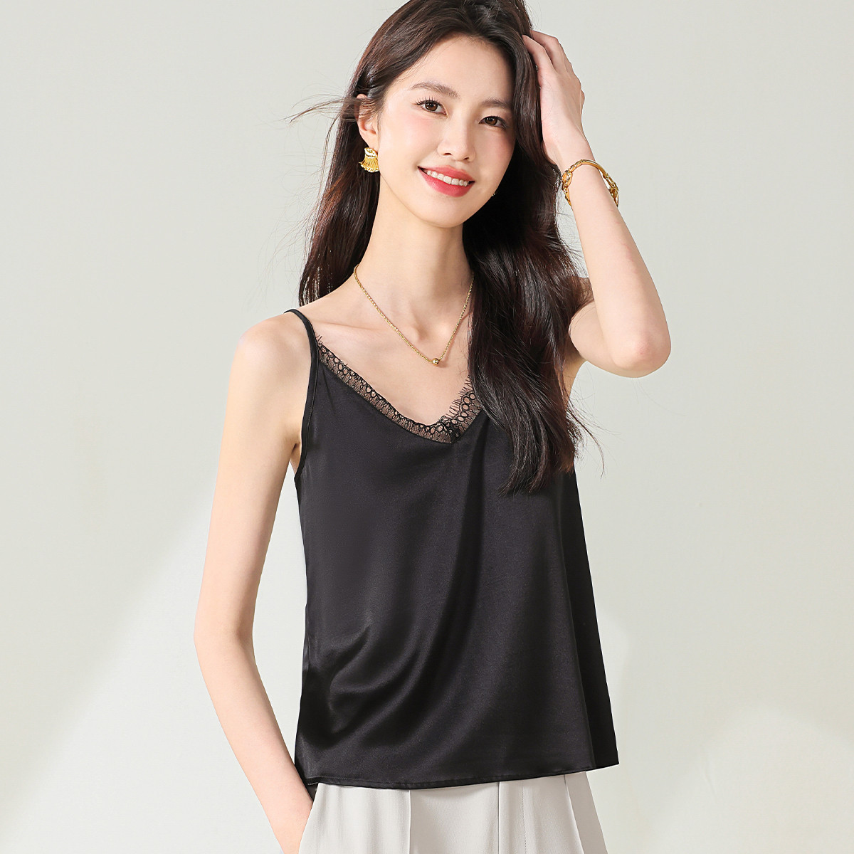 【桑蚕丝】纯色V领蕾丝桑蚕丝背心吊带无袖衬衣内搭 601747