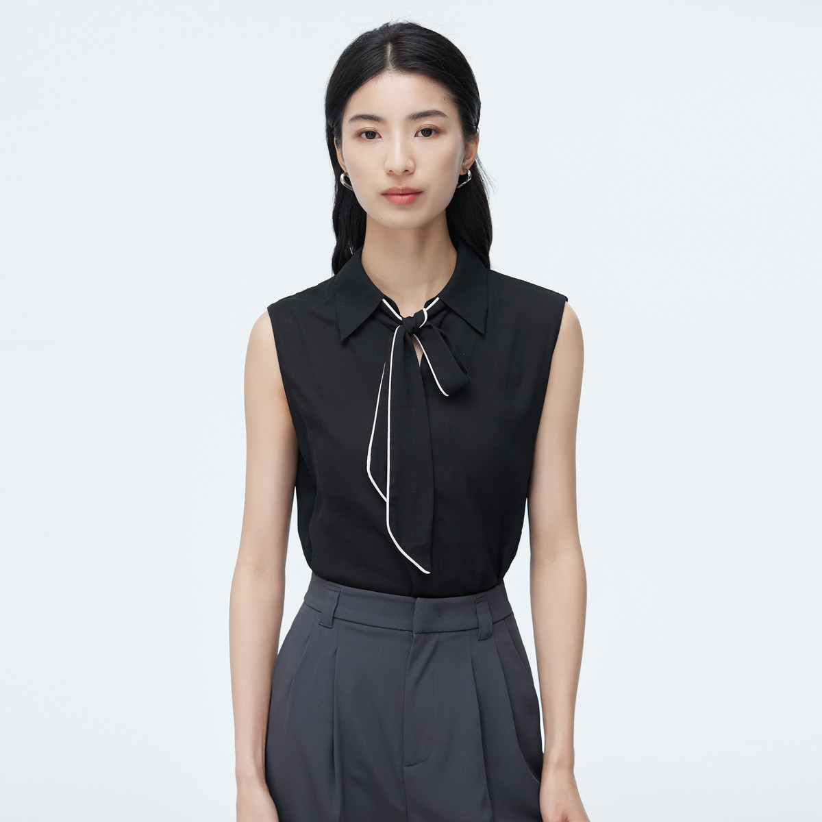 百搭气质无袖polo领衬衫女夏季款时尚通勤背心上衣飘带衬衣 059523