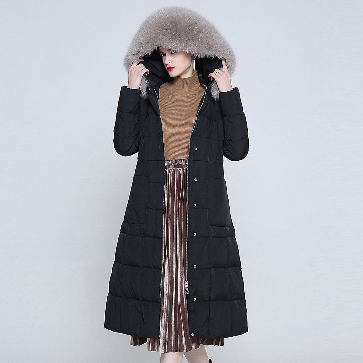 经典款简约狐狸大毛领修身显瘦连帽厚款女士长款羽绒服 909727