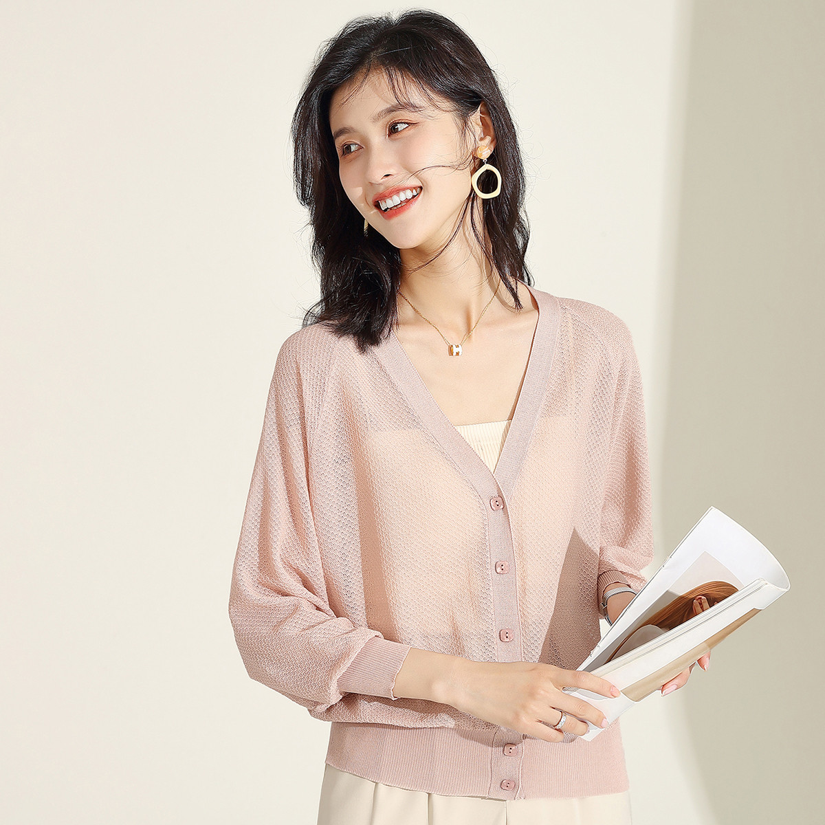 【泡泡袖】23夏季新款气质V领镂空冰丝空调衫薄款针织开衫外套 806239