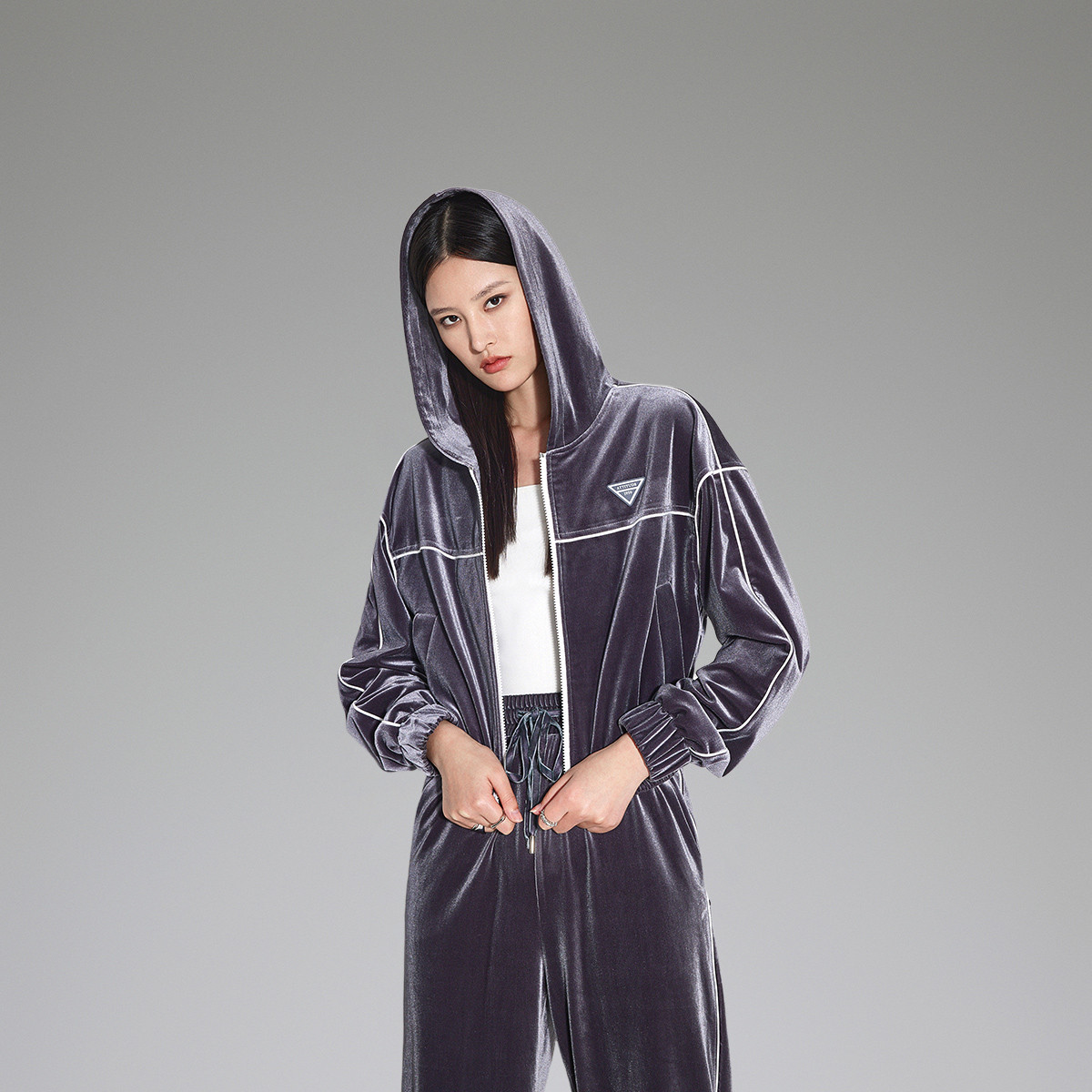 黑标系列春装 休闲连帽短上衣弹力丝绒运动外套女 483343