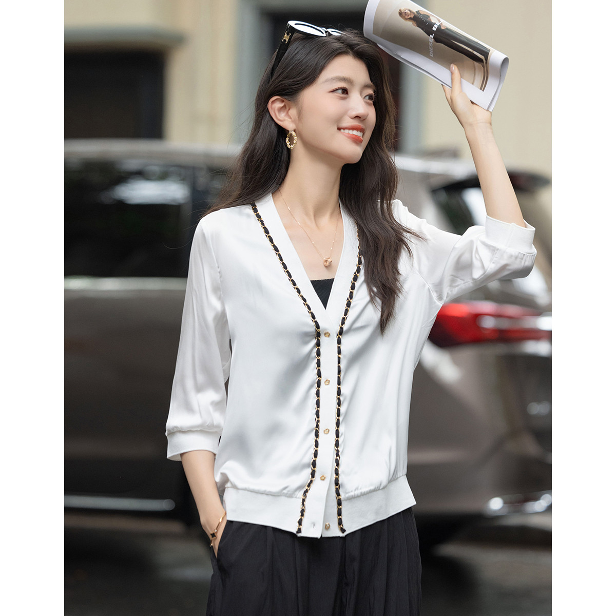 【通勤缎面短外套】春秋宽松外套女短款链条罗纹拼接女外套 771009