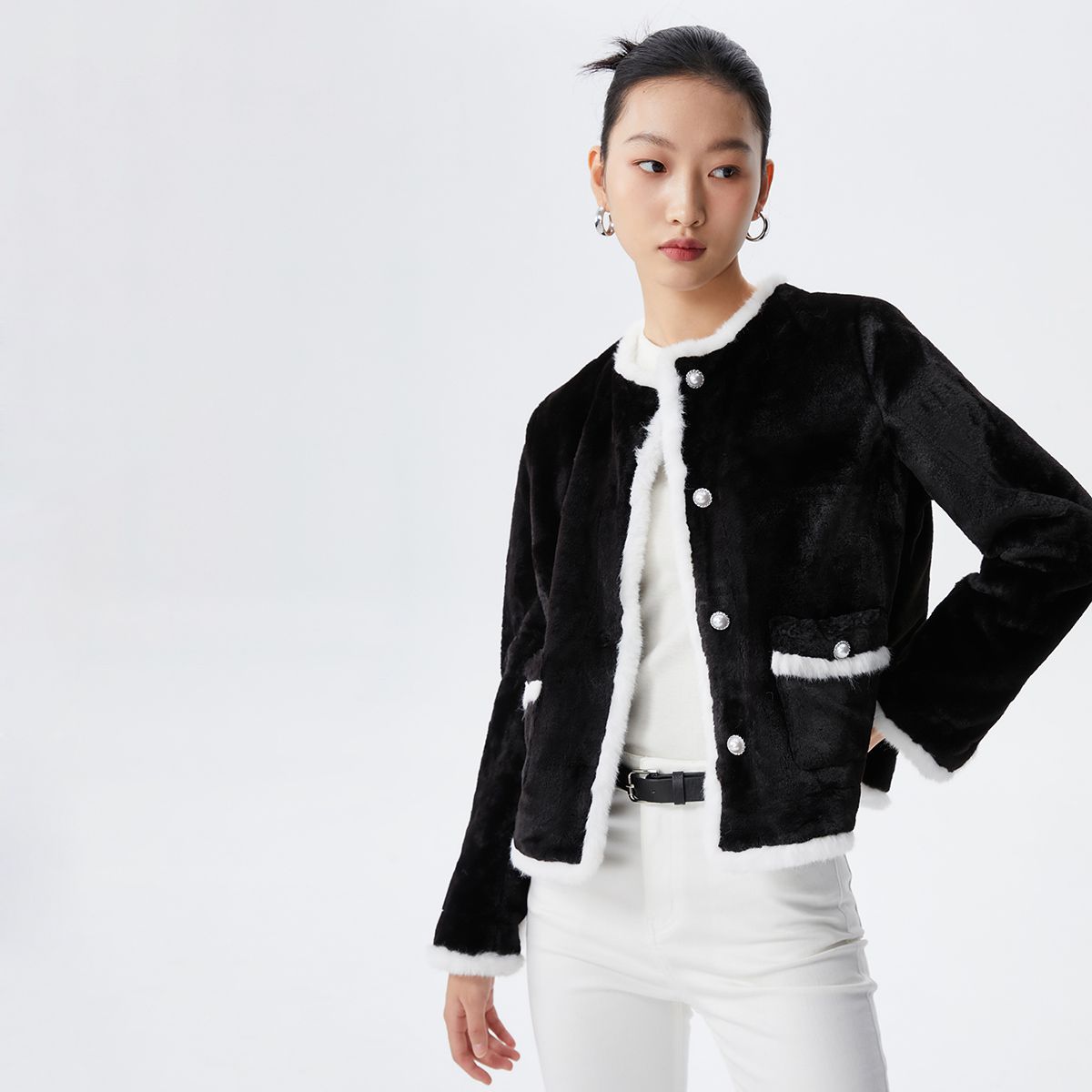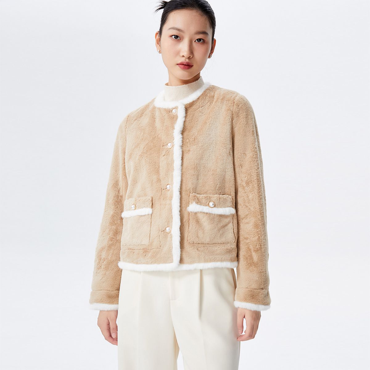 【春秋款】宽松毛绒圆领拼色优雅气质淑女夹克外套女 706769