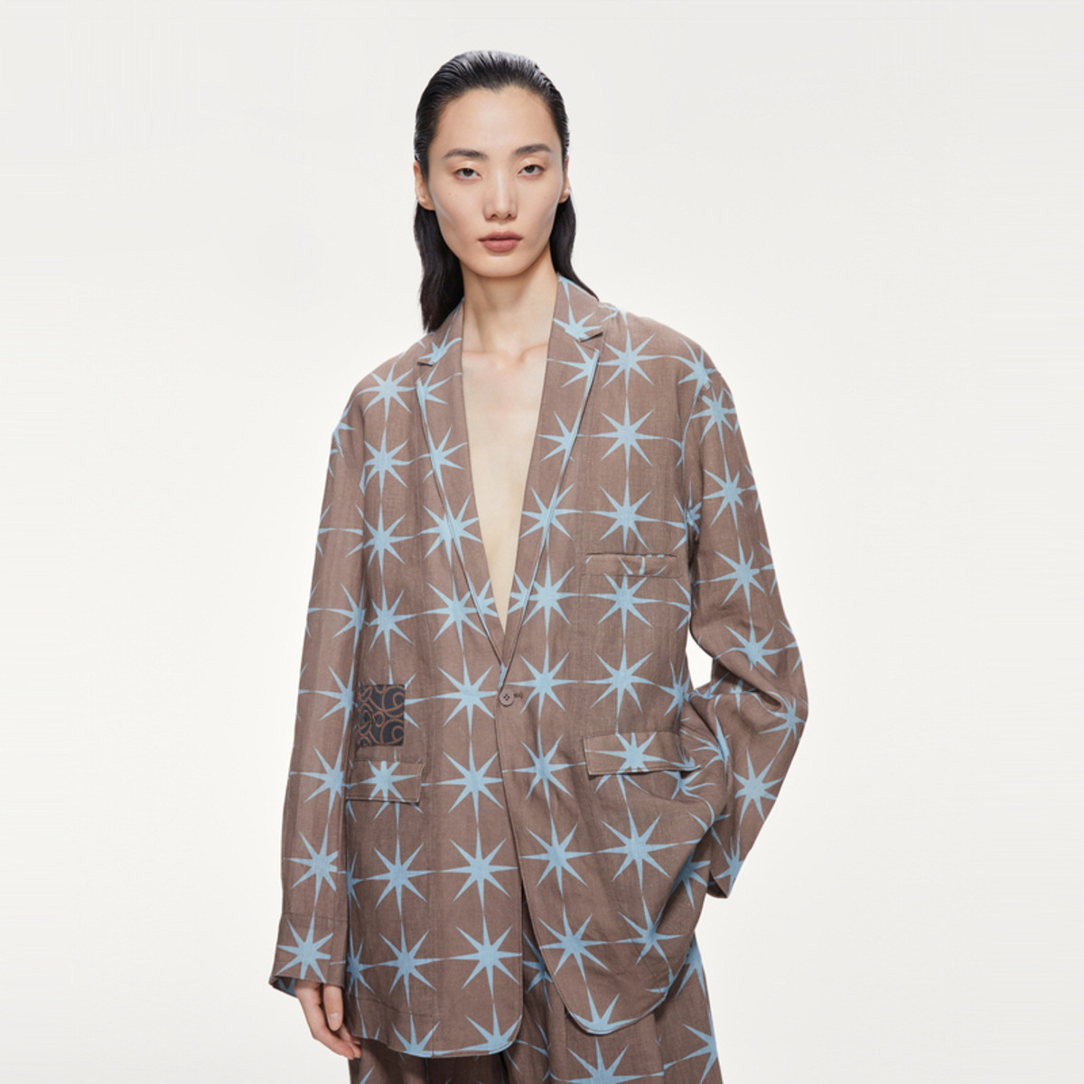 春西装宽松麻料印花西服女 318411