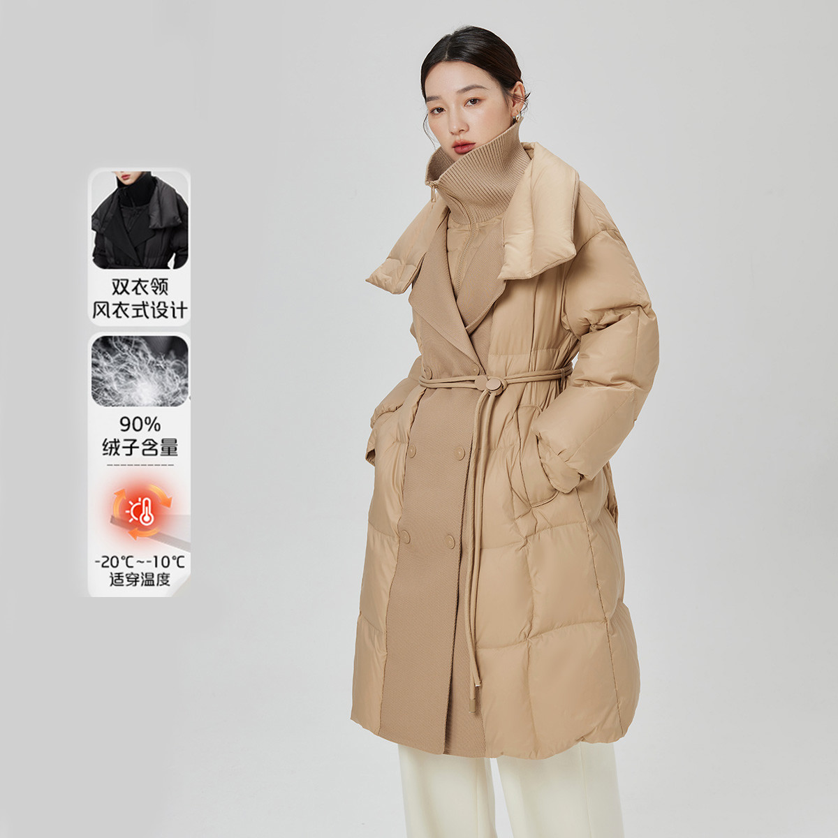 时尚风衣式翻领羽绒服女中长款鸭绒服气质通勤双层领收腰羽外套女 047702