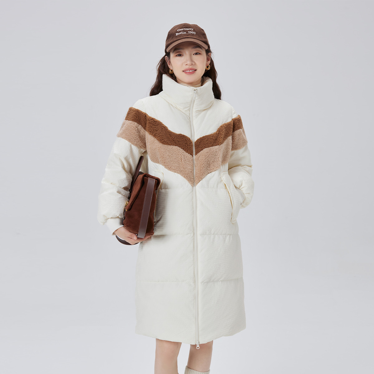 仿羊羔毛拼接女式羽绒服女长款宽松休闲立领外套女 019158