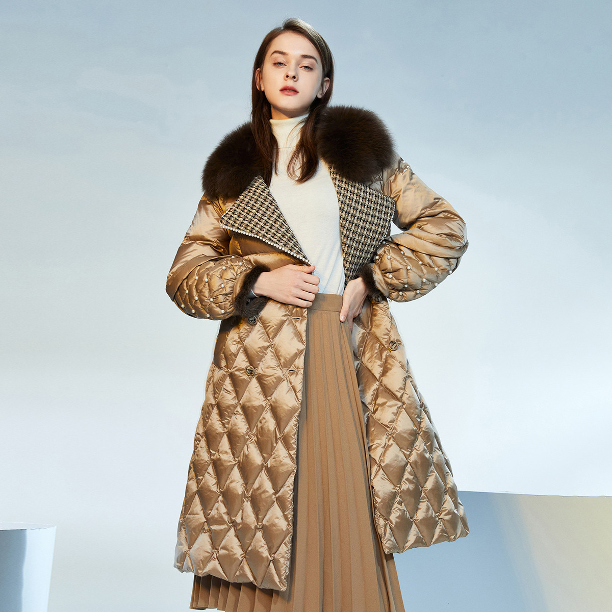 小香风奢华狐狸毛领女款羽绒服V领菱形格纹重工长款外套 324831