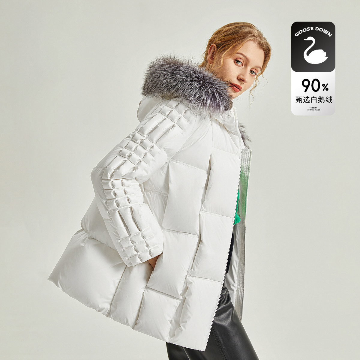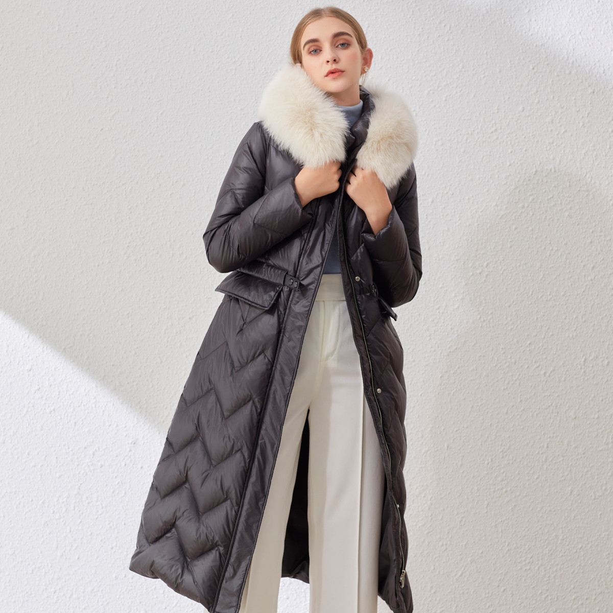 【90鸭绒】宽松中长款翻领收腰时尚保暖羽绒服女 578646