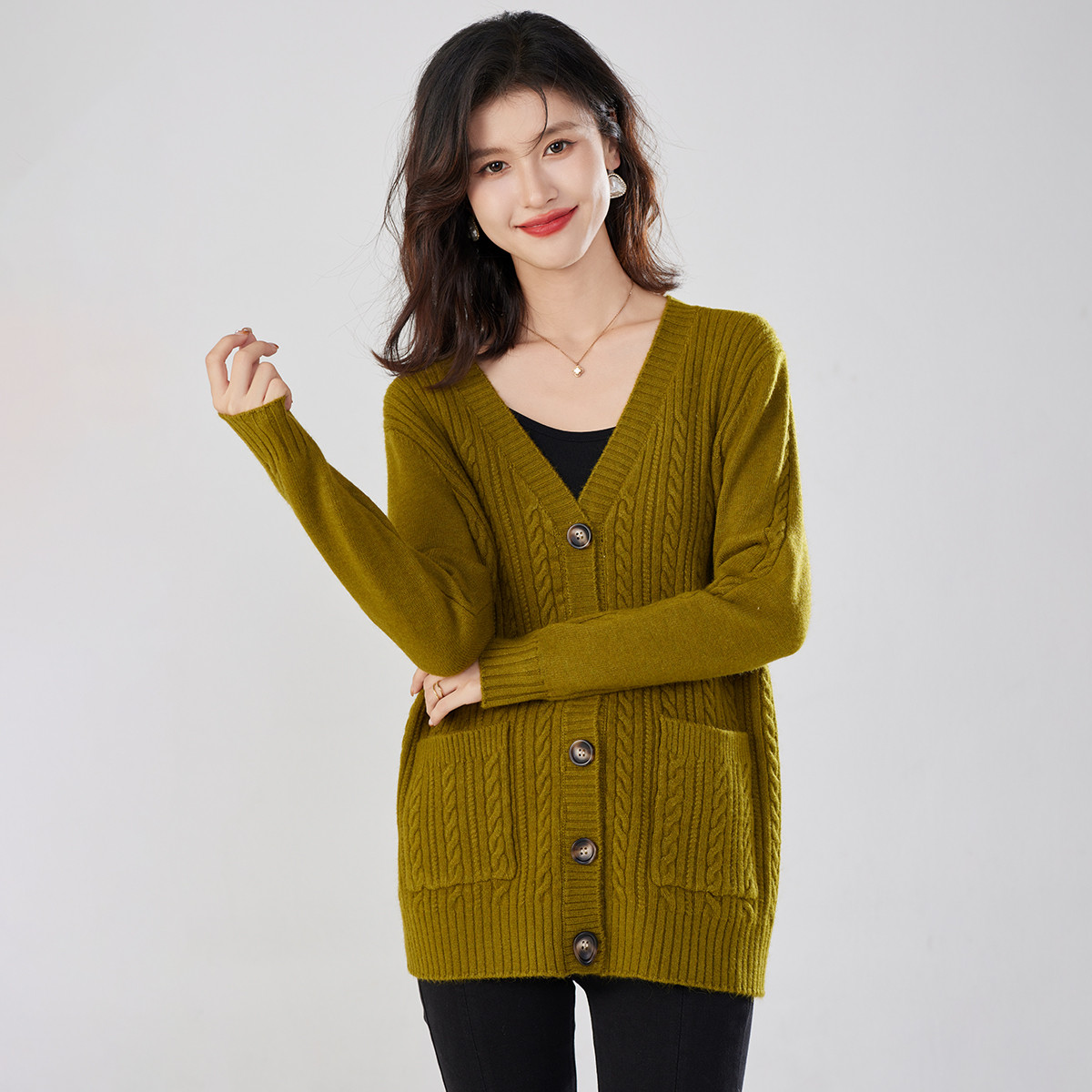 【气质V领中长款】基础通勤百搭针织开衫外套女复古扭花毛衣外套 717151