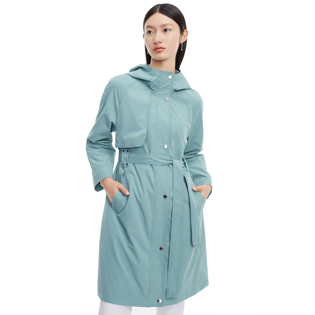 玖姿旗下安娜蔻系列纯色拼接休闲系带连帽女式风衣 236492