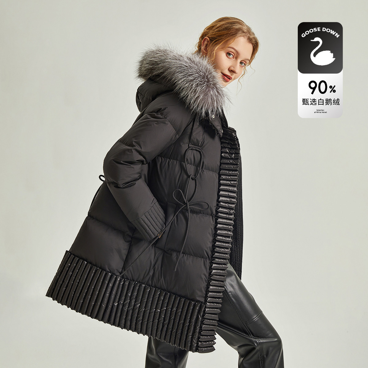 【鹅绒】轻柔零压无束加厚女士学院风减龄连帽宽松中长款羽绒服 328415