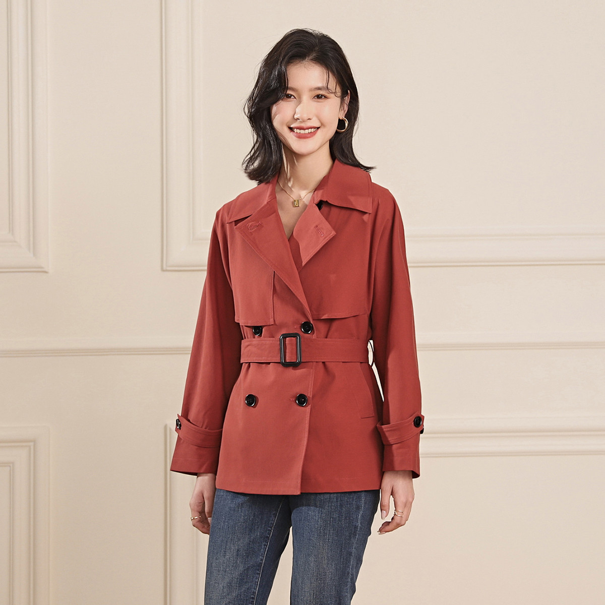 春秋新款小个子韩版长袖双排扣短款侧插袋女式系带风衣外套 347359