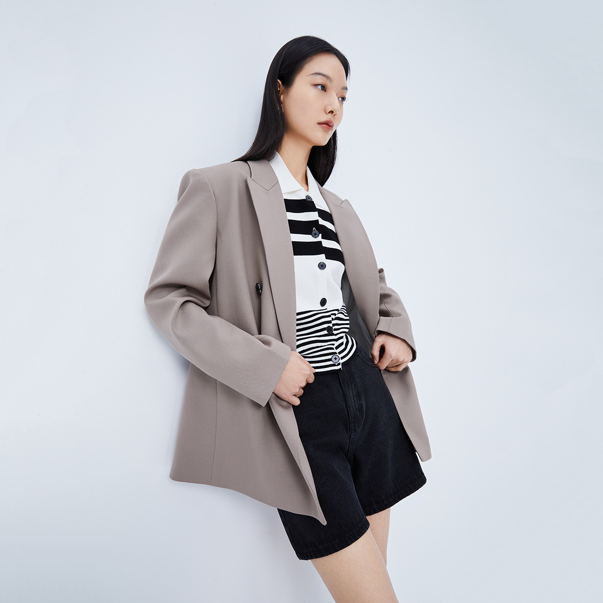 【商场同款】春季质纯色通勤款利落大气双排扣静奢西装外套 585563