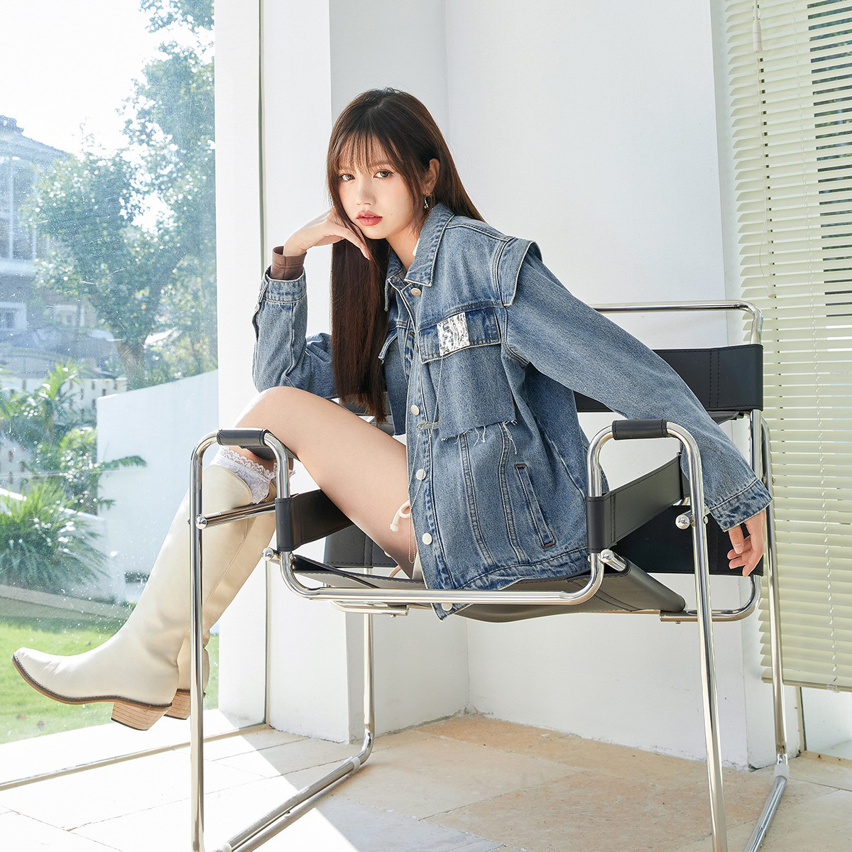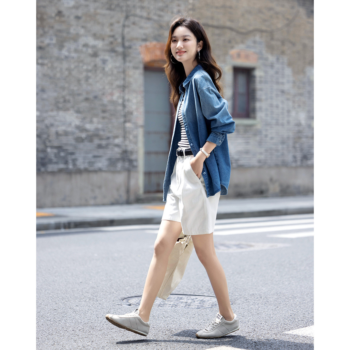 【牛仔计划】秋款纯棉舒适遮肉高频好搭中长款牛仔衬衫式外套女 048193