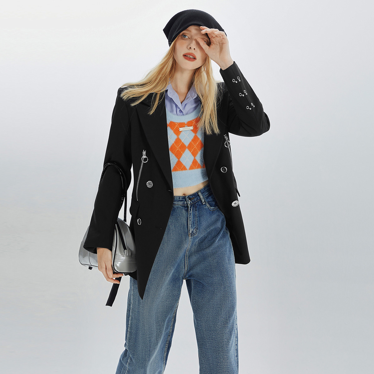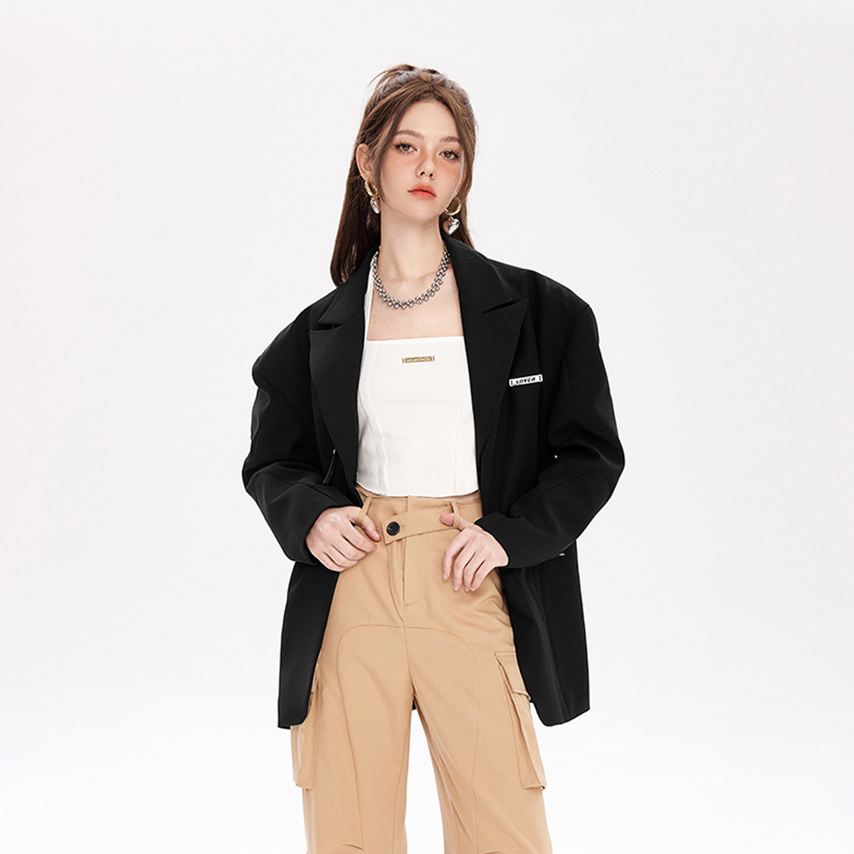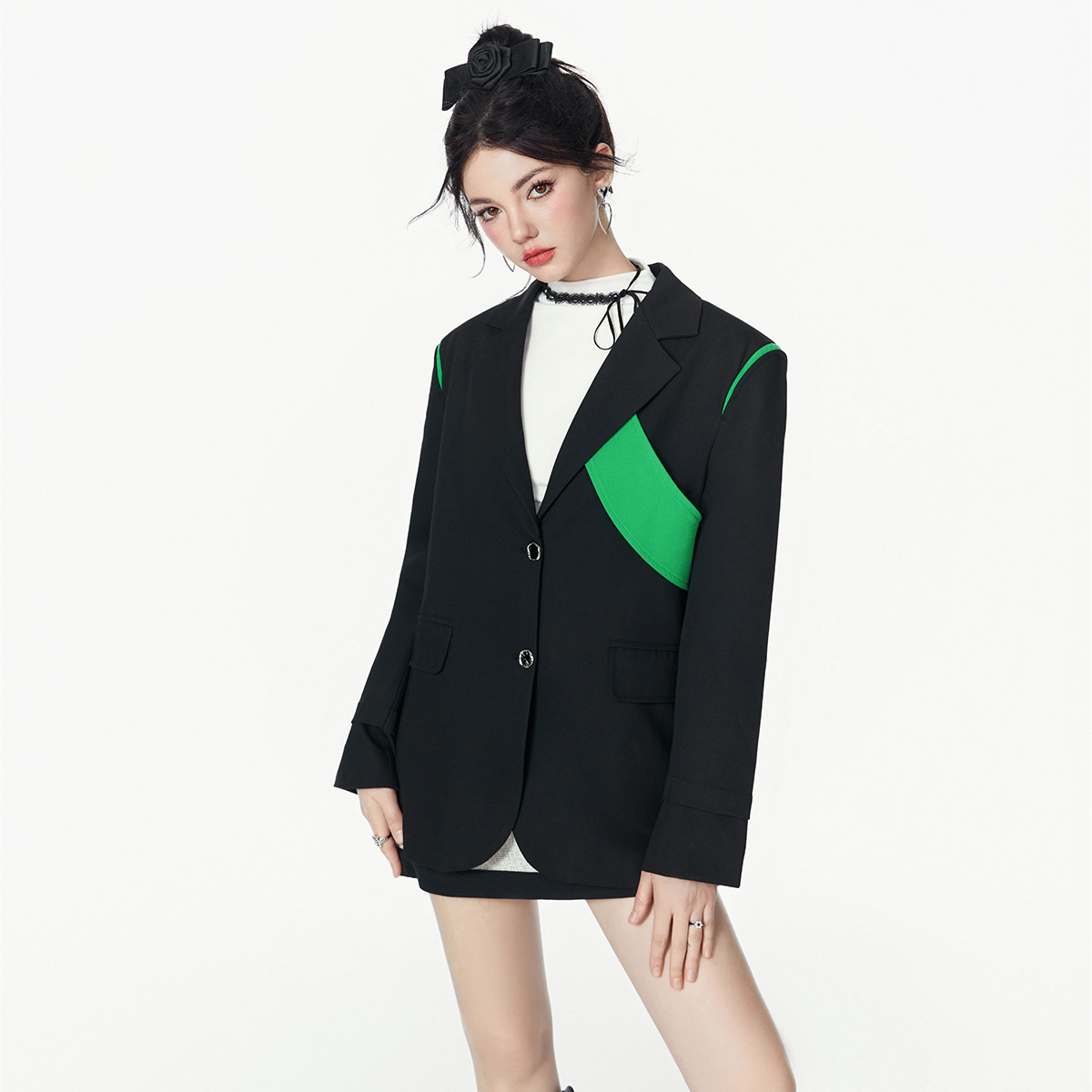 春秋高级感撞色西装女垫肩宽松圆环扣小众时尚西服 088340