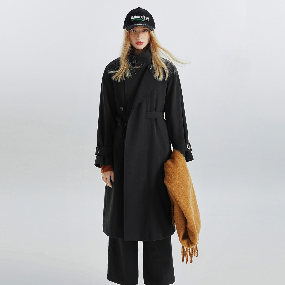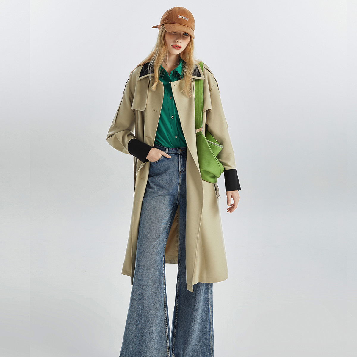 【秋装热卖】撞色领口复古韩系腰带风衣外套女高级感小众长款上衣 347156