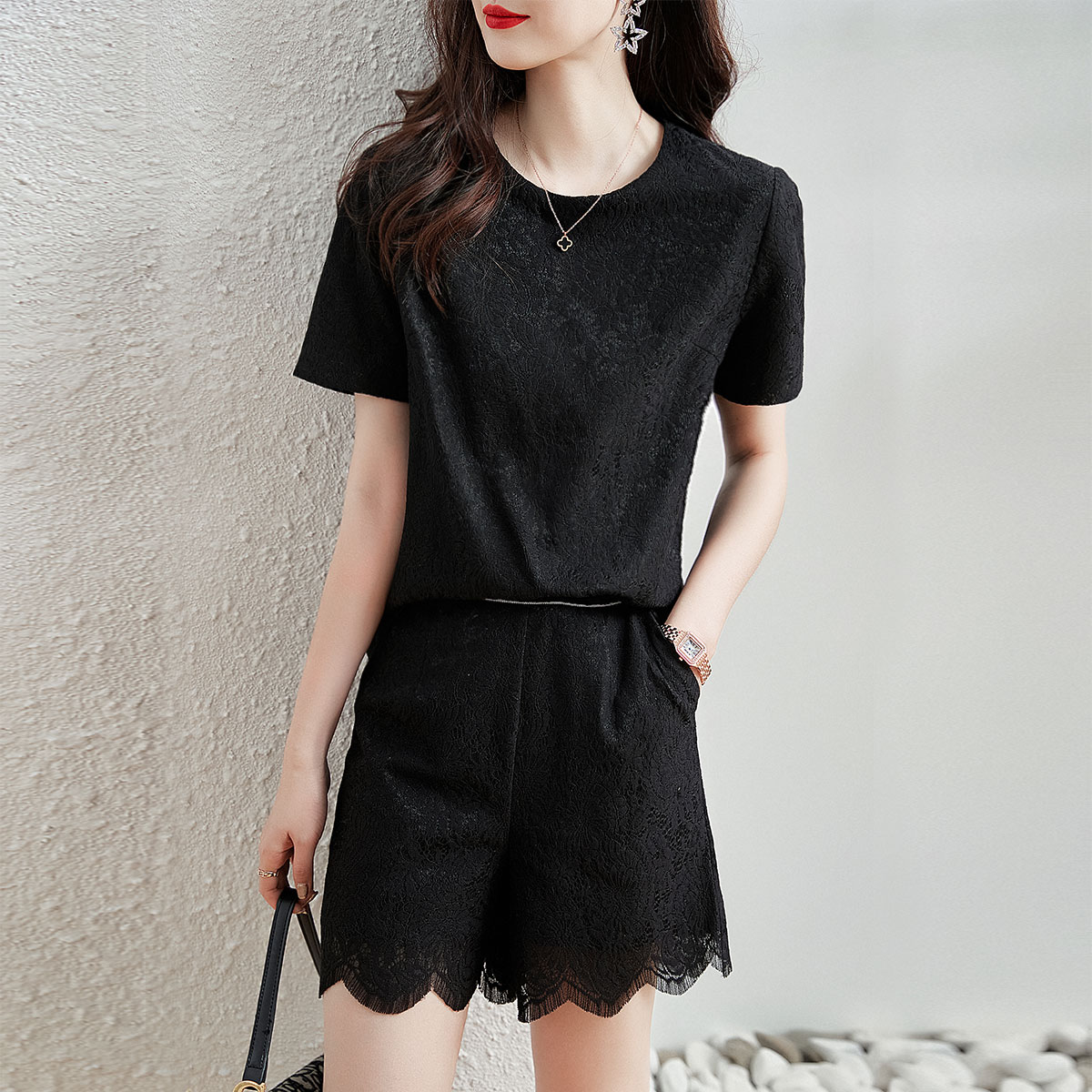 【蕾丝套装】夏新圆领短袖上衣A字花边阔腿短裤套装女时尚 529857