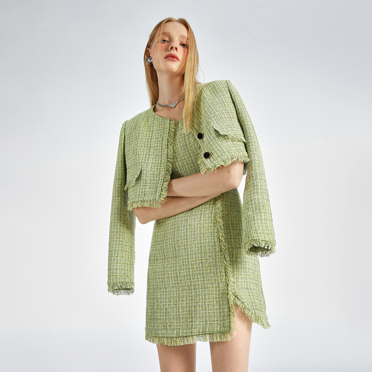 地素粗花呢外套春秋季专柜毛边流苏外套女 022987