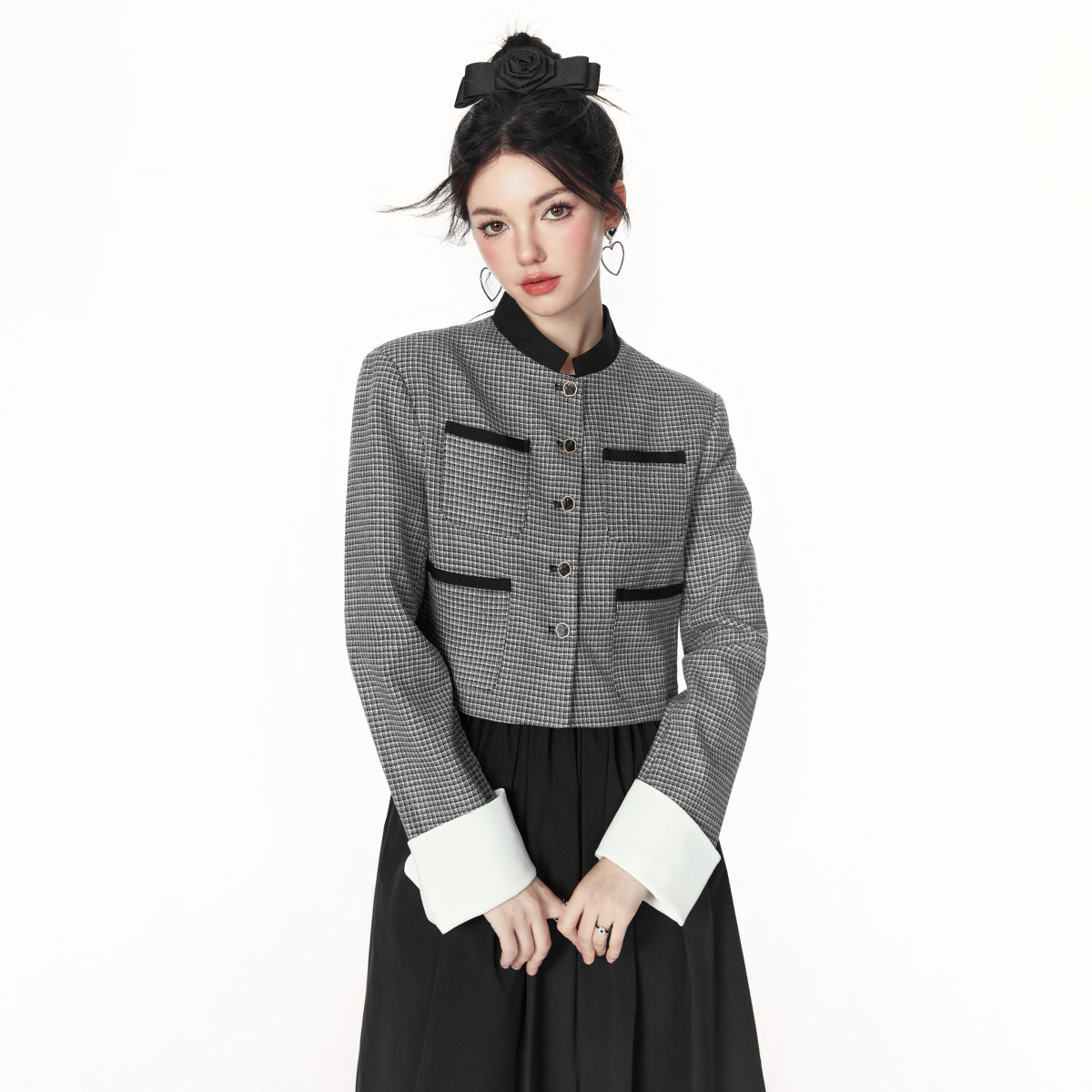 格纹爆款外套春秋撞色立领外套女法式设计感小众短上衣 368212