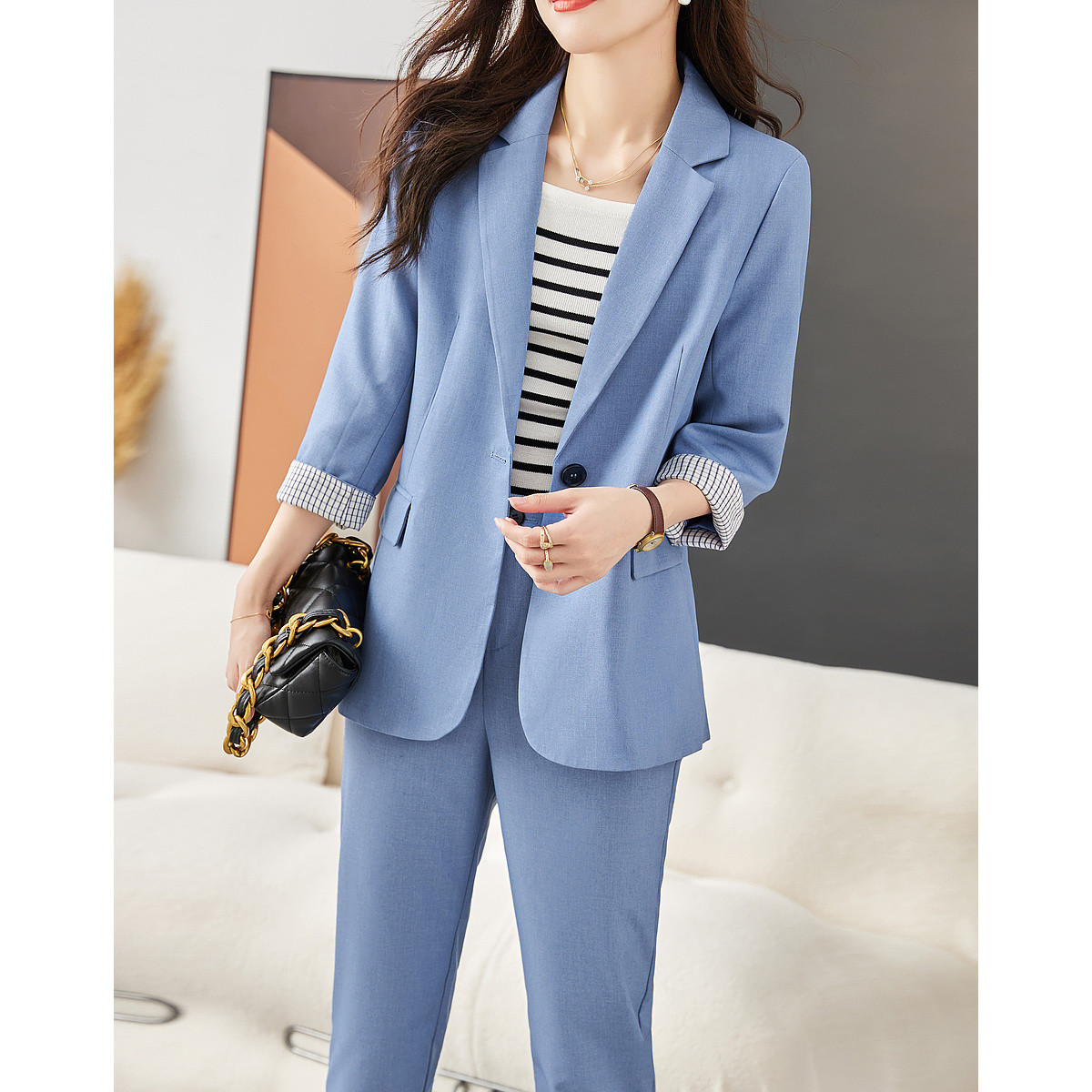 【通勤套装】秋季七分袖修身上衣格纹女裤子套装女两件套 530753