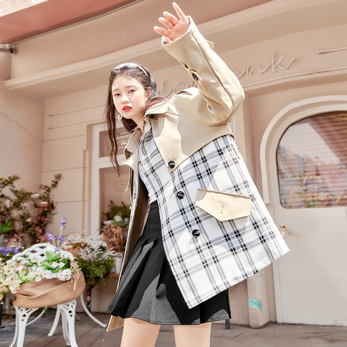春秋拼接翻领风衣女时尚欧美流行撞色收腰短款薄外套 888724