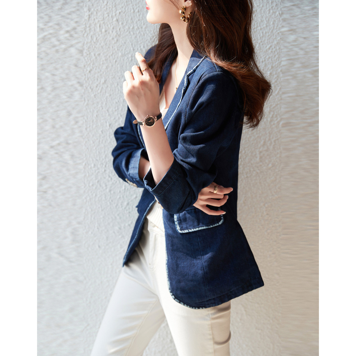 【智型丹宁】春秋通勤风云朵棉撞色边翻领一粒扣修身女式牛仔外套 171457